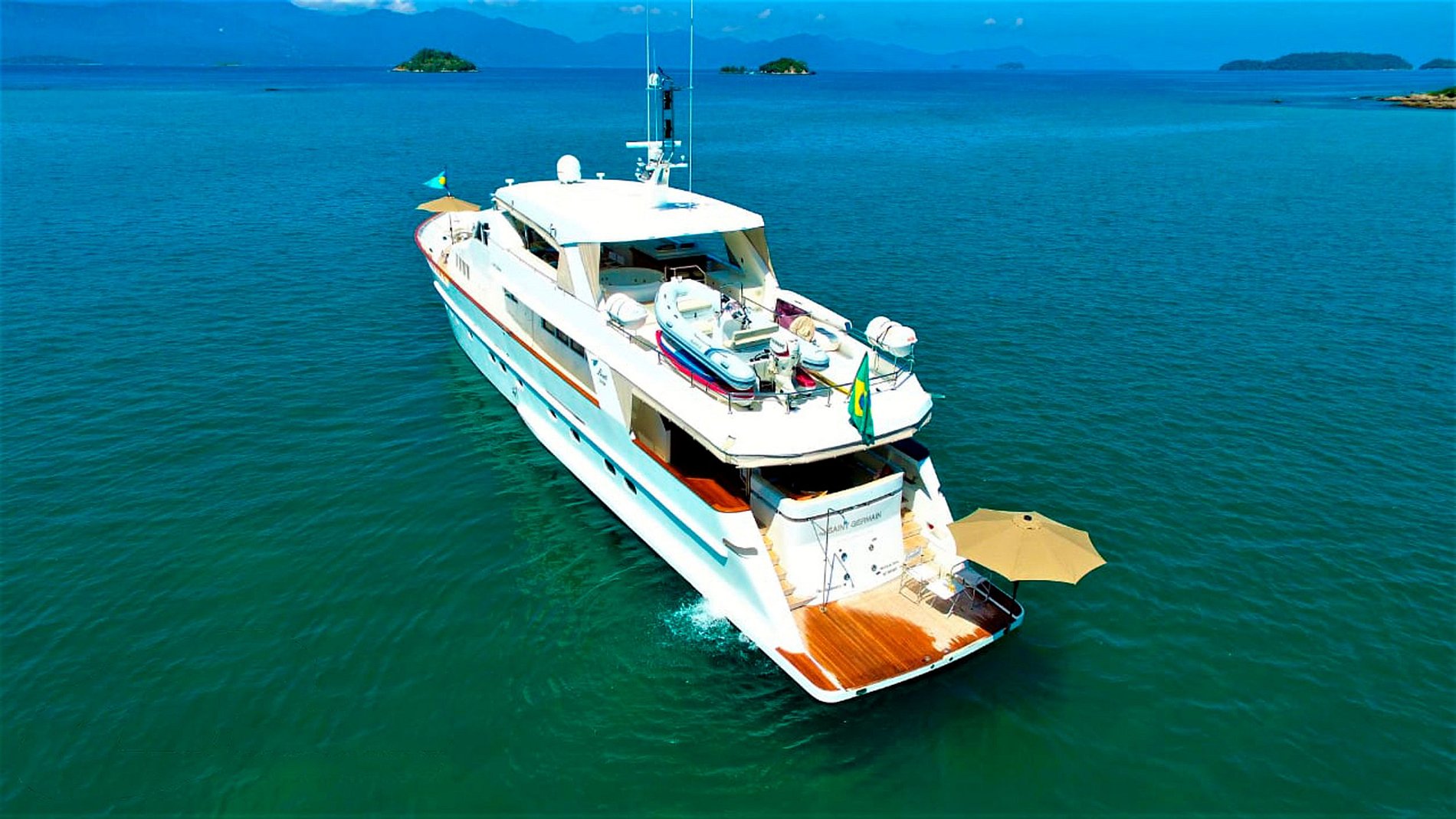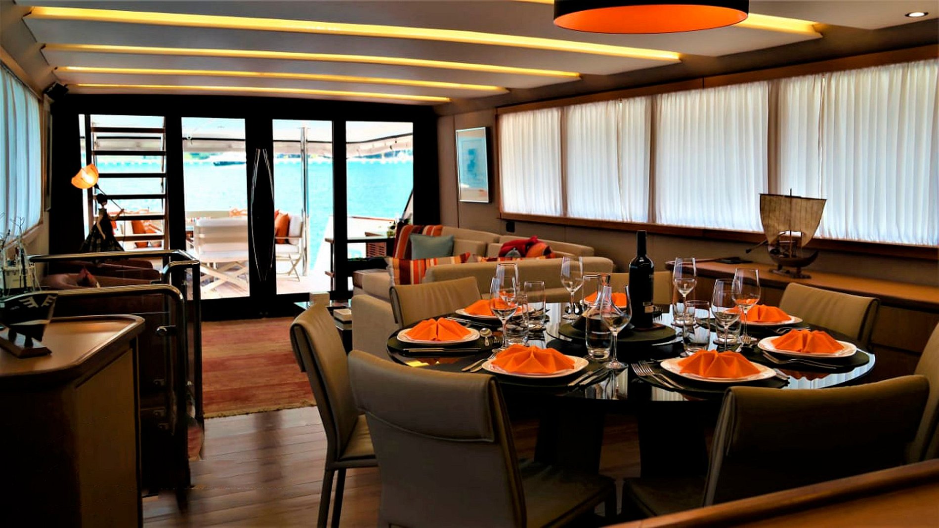 Ce bateau dispose de 5 cabines, 5 salles de bain, un salon, une salle TV, une salle à manger entièrement équipée, une buanderie, un jacuzzi, une baignoire, un barbecue, un bar, et bien plus encore.