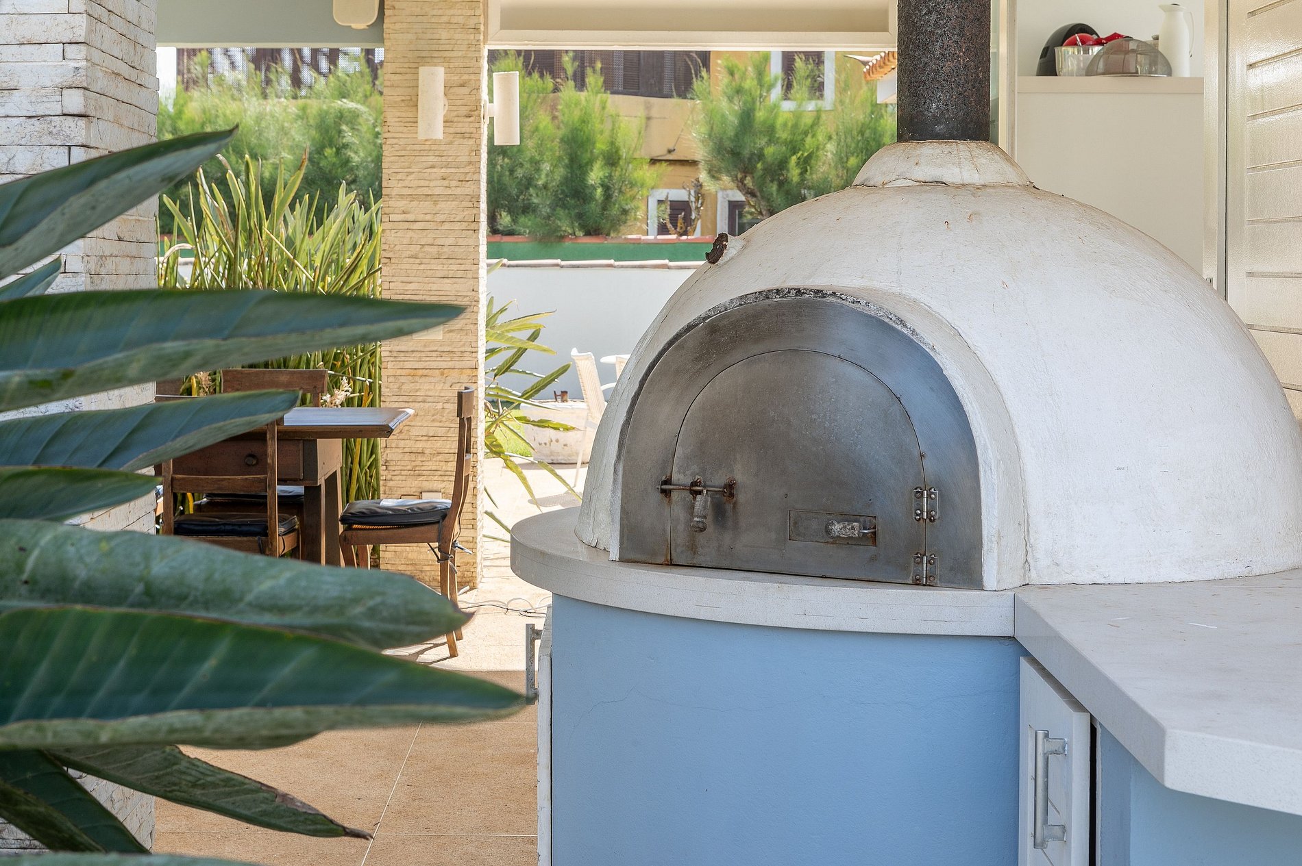 L'espace extérieur comprend une piscine à débordement, où vous pouvez vous détendre sur des chaises longues et profiter d'une vue agréable sur l'océan. La véranda, qui s'étend jusqu'à la pelouse, dispose d'un barbecue en acier inoxydable et d'un four à bois, adaptés pour des moments de loisirs en famille et entre amis.