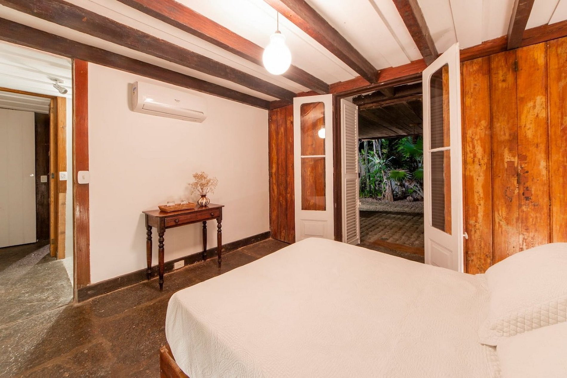 La maison dispose de cinq suites climatisées, complètes et équipées d’un minibar. Son projet rassemble des matériaux qui mettent en valeur la sensibilité et la durabilité recherchées par les propriétaires. Le mobilier principalement en bois met en avant cet air rustique-colonial qui finit par correspondre parfaitement à l’environnement dans lequel la propriété est située.