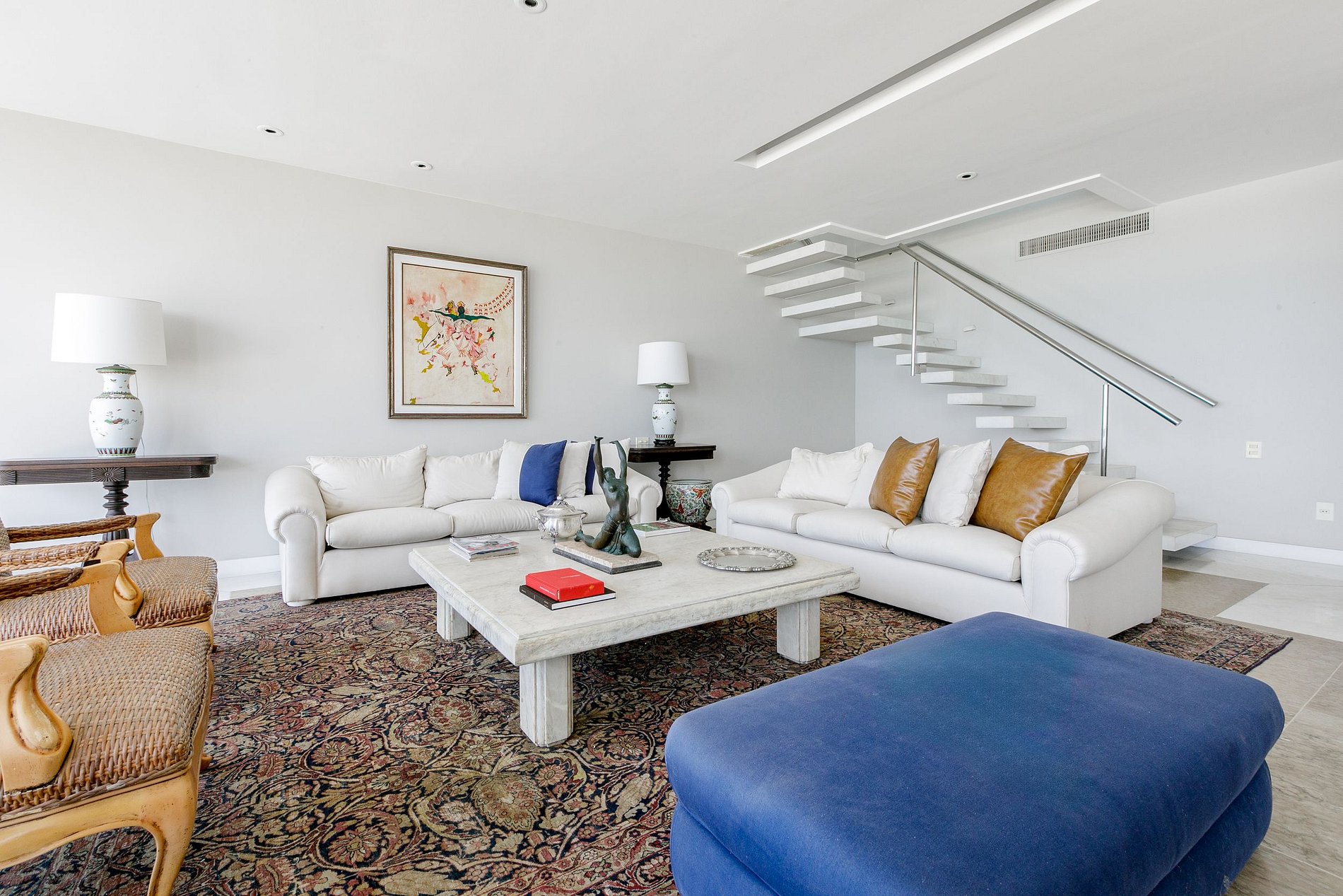 Dans la zone chambres au premier étage, le penthouse dispose de quatre chambres dont deux suites spacieuses et climatisées dont une reliée à la quatrième chambre, 1 salle de bain invités, cuisine meublée et coin buanderie avec dépendance complète.