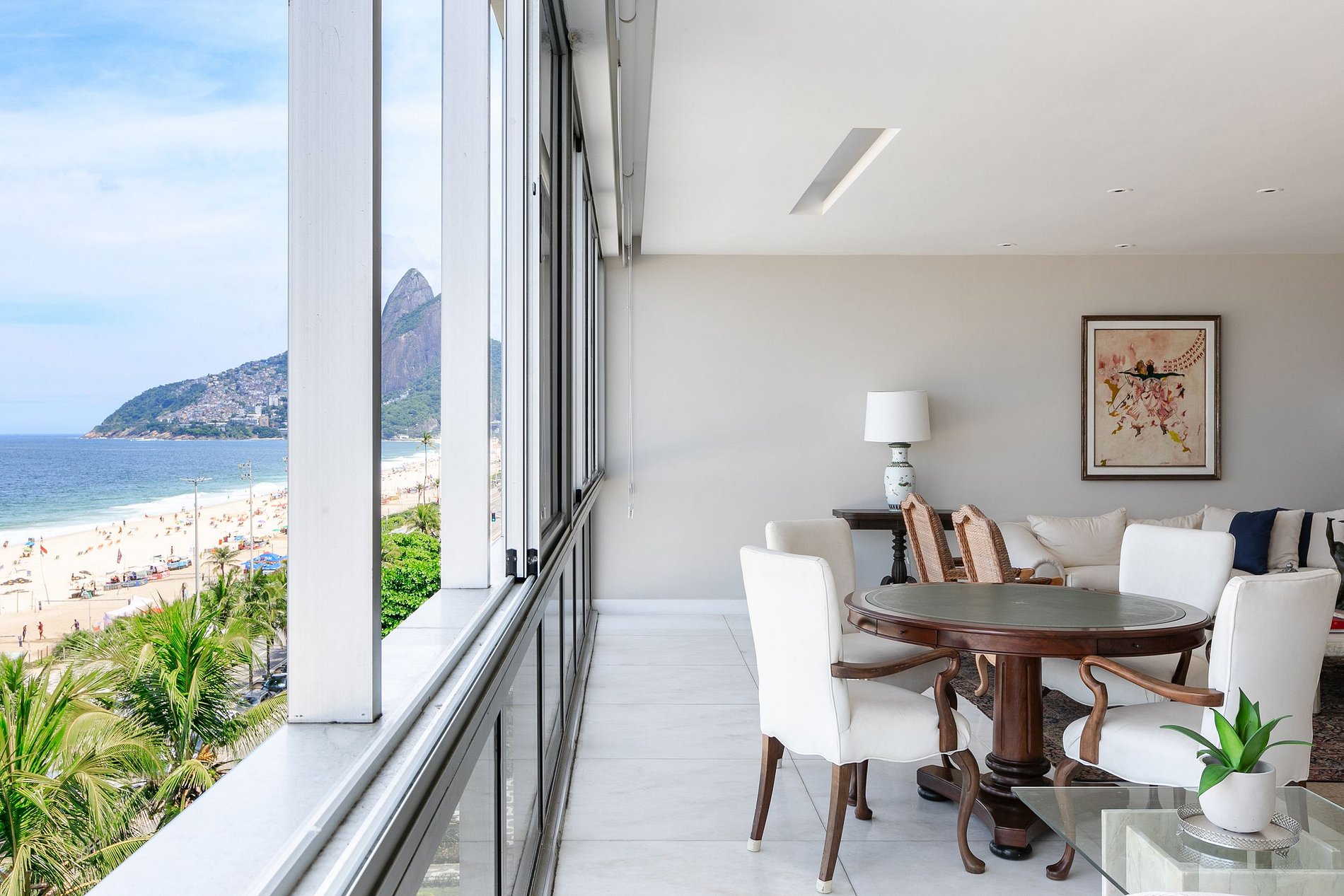 L'accès au deuxième étage se fait par un escalier et dispose d'un séjour avec cuisine d'appui, avec une agréable terrasse avec vue panoramique sur le littoral d'Ipanema, WC, suite parentale climatisée reliée au balcon.