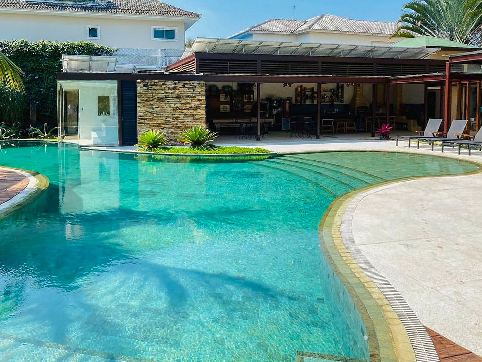 L’espace extérieur gourmet a été conçu pour recevoir famille et amis dans une ambiance raffinée et conviviale, avec un barbecue, une table de billard, une table de ping-pong et une cave à vin rustique et exclusive. Chaque détail de la villa a été pensé pour offrir une expérience inoubliable au cœur de Barra da Tijuca.
