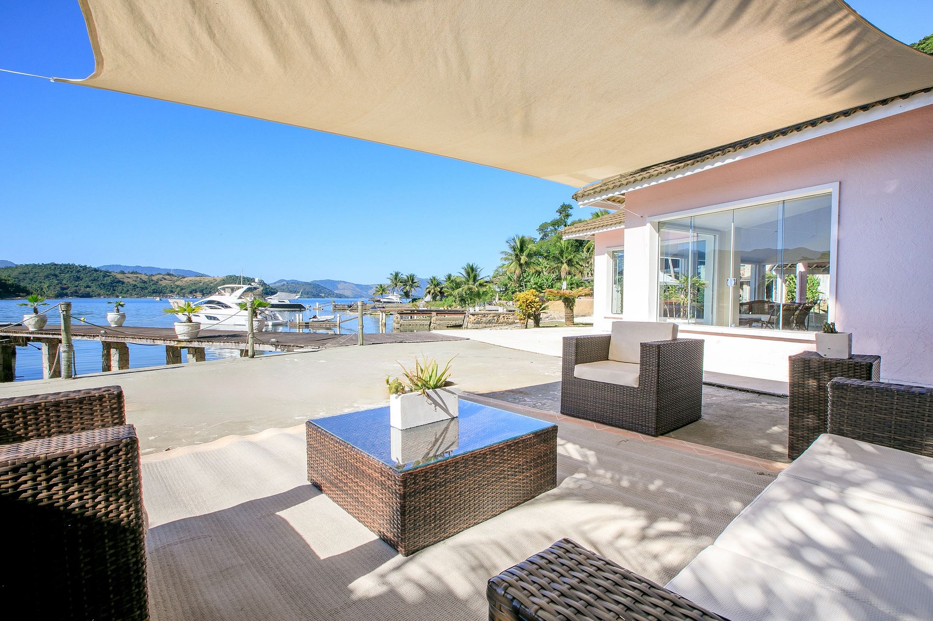 Une maison typique en bord de mer de style brésilien qui dispose d'une salle à manger, d'un salon, d'une piscine, d'un barbecue et d'une jetée. Une belle plage privée juste en face de vous fait face à la mer calme d'Angra dos Reis.