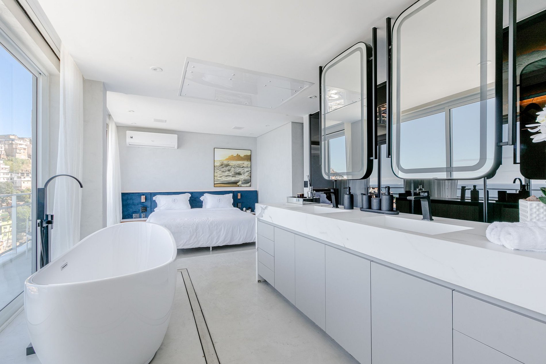 Admirer le lever du soleil depuis ce penthouse est une expérience extraordinaire et inoubliable. La vue époustouflante qui s'offre à vous dès que vous entrez dans ce duplex de 241 m² est impressionnante, même pour de nombreux Cariocas. Cela suffirait déjà à en faire un joyau de notre portfolio, niché dans le Morro do Vidigal, mais ce penthouse a encore bien plus à offrir.