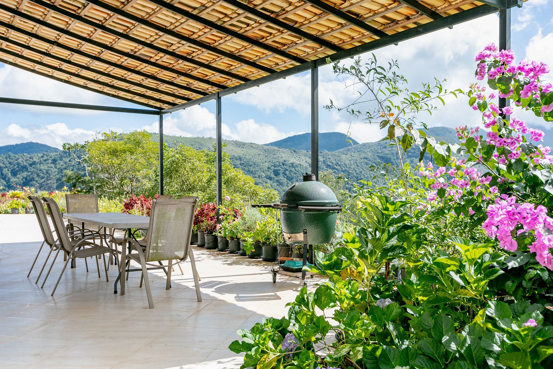 En compagnie des nombreuses fleurs qui sont partout, nous descendons à un niveau inférieur où nous trouvons la piscine et l'espace gourmand avec barbecue, sauna, hamacs pour se reposer et, bien sûr, la vue fabuleuse toujours présente.