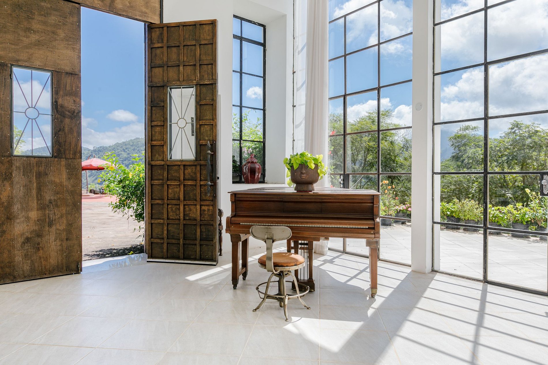 Entourée de cultures colorées des espèces de fleurs les plus variées, se trouve une belle maison avec d'immenses fenêtres en verre qui laissent entrer la lumière naturelle et forment de magnifiques dessins et ombres dans toutes ses pièces. Depuis les grands portails ornés de peintures peintes à la main, le salon et la salle à manger s'étendent - agrémentés d'un billard - et mènent à la gracieuse cuisine très bien équipée à l'arrière. Les hauts plafonds apportent une sensation d'espace et de confort.