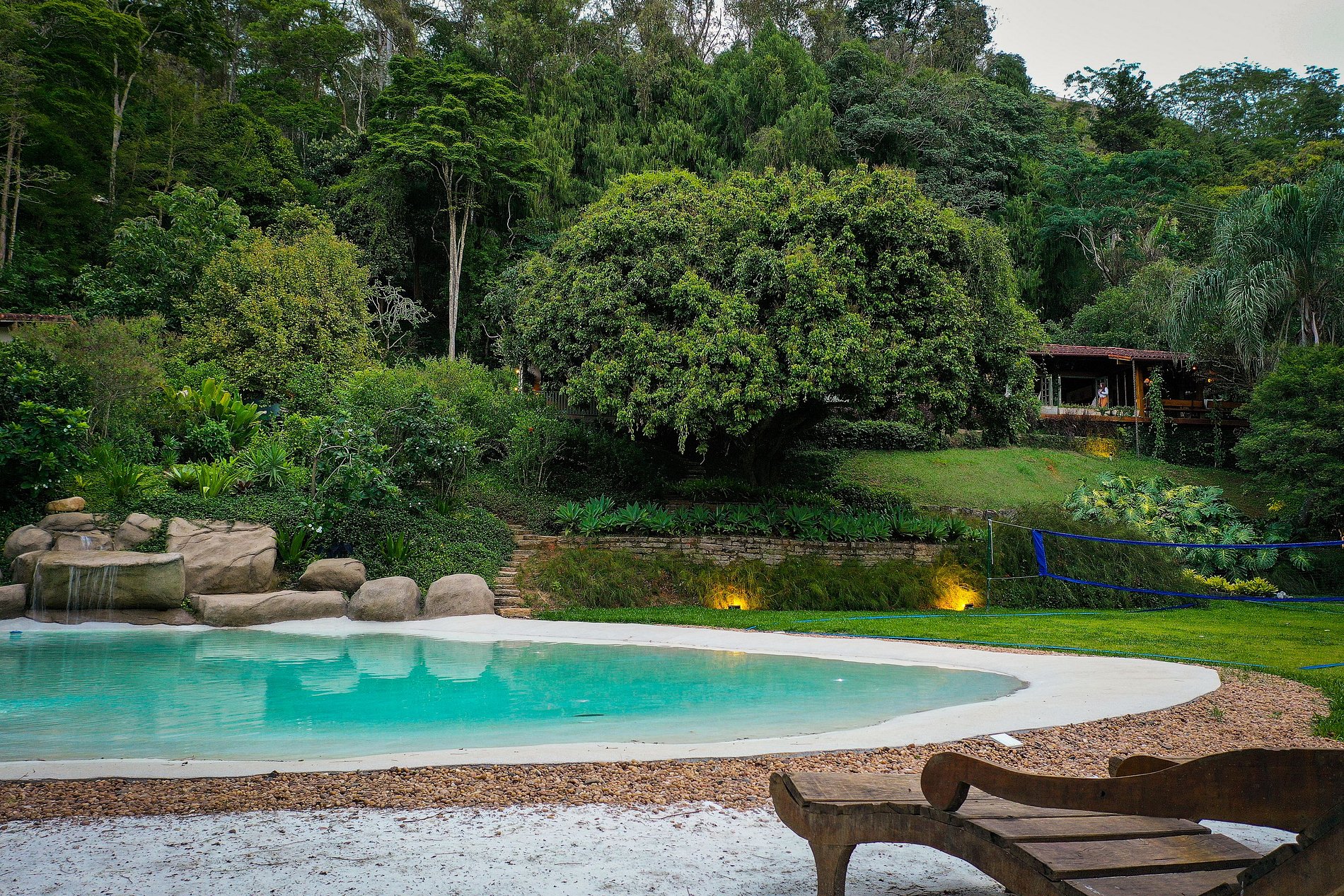 Mais c'est à l'extérieur que la véritable magie opère. Une incroyable piscine qui imite une plage aux eaux cristallines et au vrai sable, accompagnée d'une structure au toit de chaume avec une grande table parfaite pour les repas et les réunions en plein air. Pour les sportifs, il y a même un terrain de volley-ball et pour ceux qui aiment faire un barbecue, un "feu au sol" est prêt à être utilisé. N'est-ce pas un rêve ?