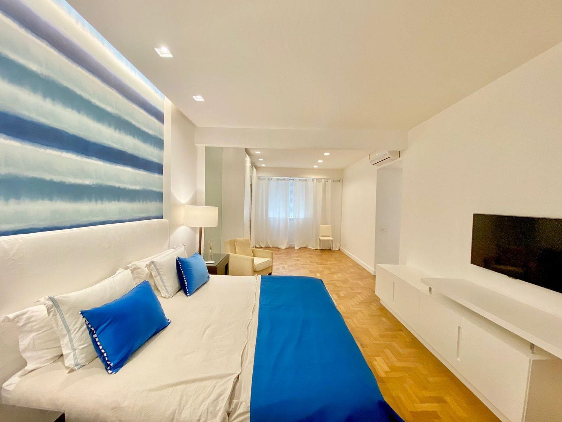 L’appartement dispose de sept climatiseurs répartis stratégiquement, assurant un confort optimal dans toutes les pièces. La suite parentale séduit par ses dimensions généreuses, ses finitions haut de gamme et sa décoration inspirée des nuances marines, évoquant la sérénité des plages cariocas.