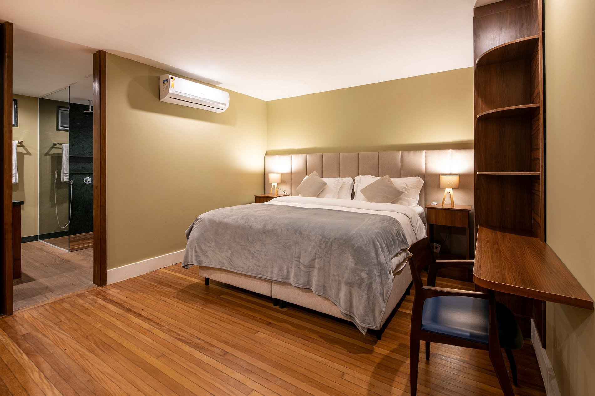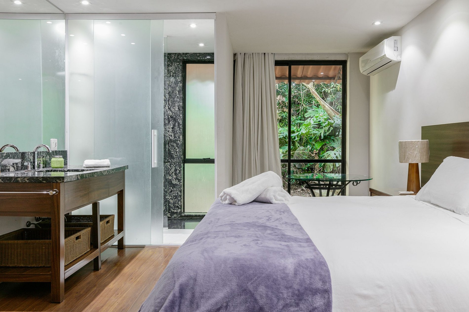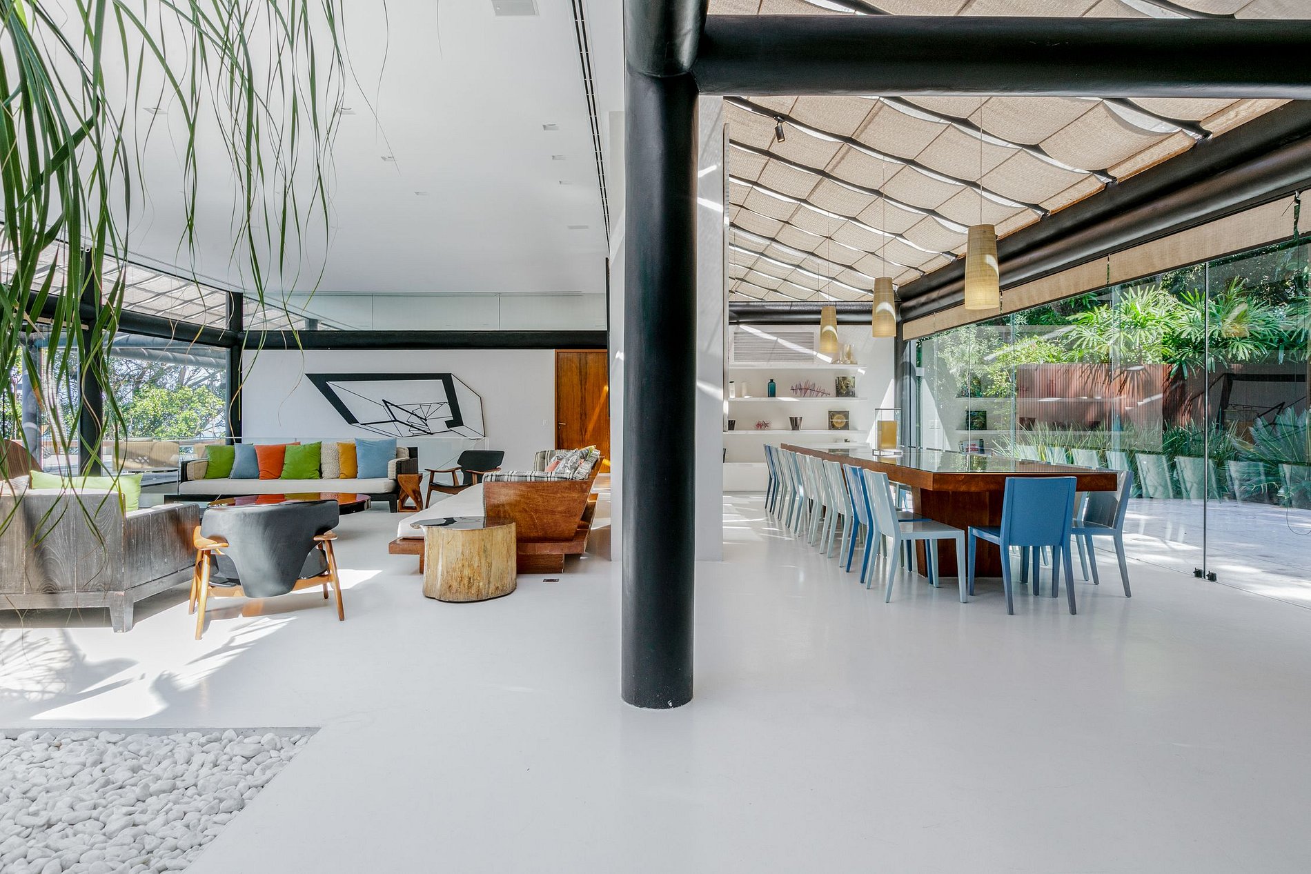 All'interno di un condominio chiuso, in un'area costruita di 900 m2, troviamo questa straordinaria dimora che si affaccia su Pedra da Gávea e sulla spiaggia di São Conrado, da dove è possibile ammirare, come in una cabina, gli amanti dello sport del deltaplano in piena attività.