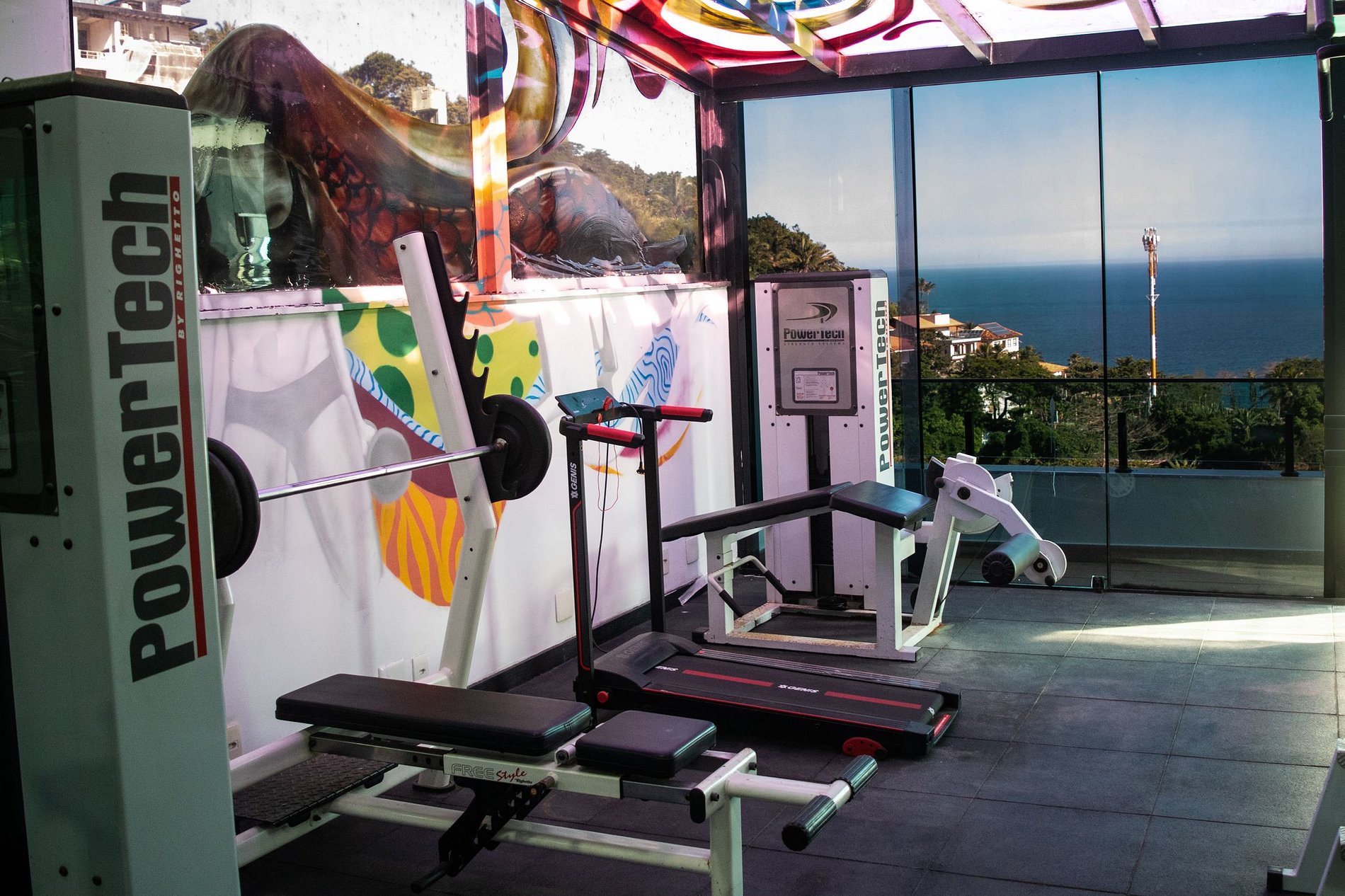 Al terzo piano, oltre alle sei camere da letto — tutte dotate di TV, aria condizionata e vista sia sul mare che sulle montagne —, troviamo una palestra pronta per chi vuole mantenere la propria routine di allenamento anche in vacanza.