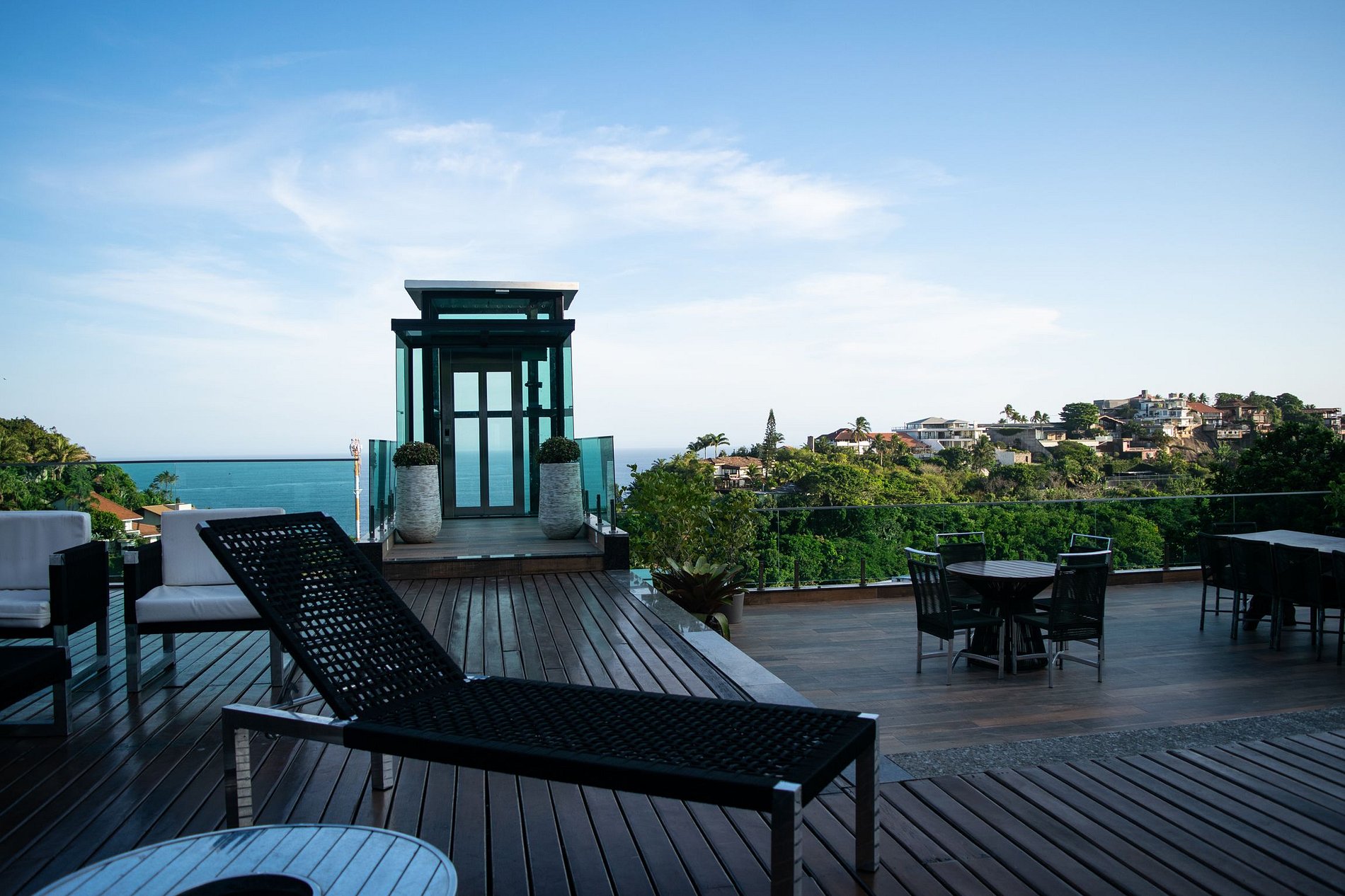 Salendo all'ultimo piano, scopriamo un fantastico terrazzo, dove risiede la magia del luogo. Dotato di piscina, sauna, vasca idromassaggio e area gourmet con tutto il supporto necessario, è il luogo perfetto per rilassarsi e intrattenere gli ospiti.