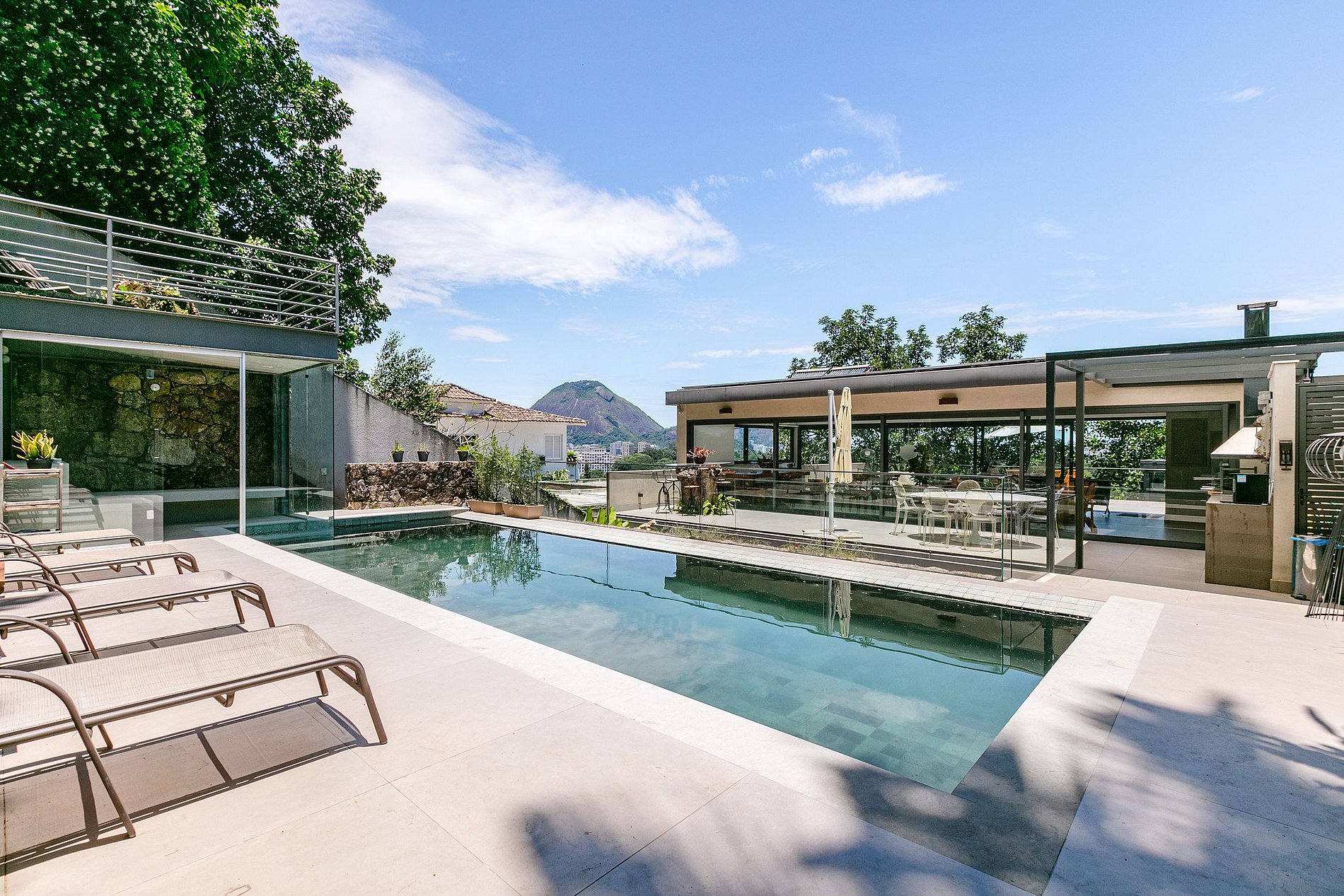 Grazie alle sue porte in vetro, l'ambiente interno risulta molto arioso e con abbondante luce. Il piano superiore si apre su una deliziosa terrazza con piscina, barbecue e una vista privilegiata sulla laguna Rodrigo de Freitas, sul monte Corcovado, sul Pan di Zucchero e sul Giardino Botanico stesso.