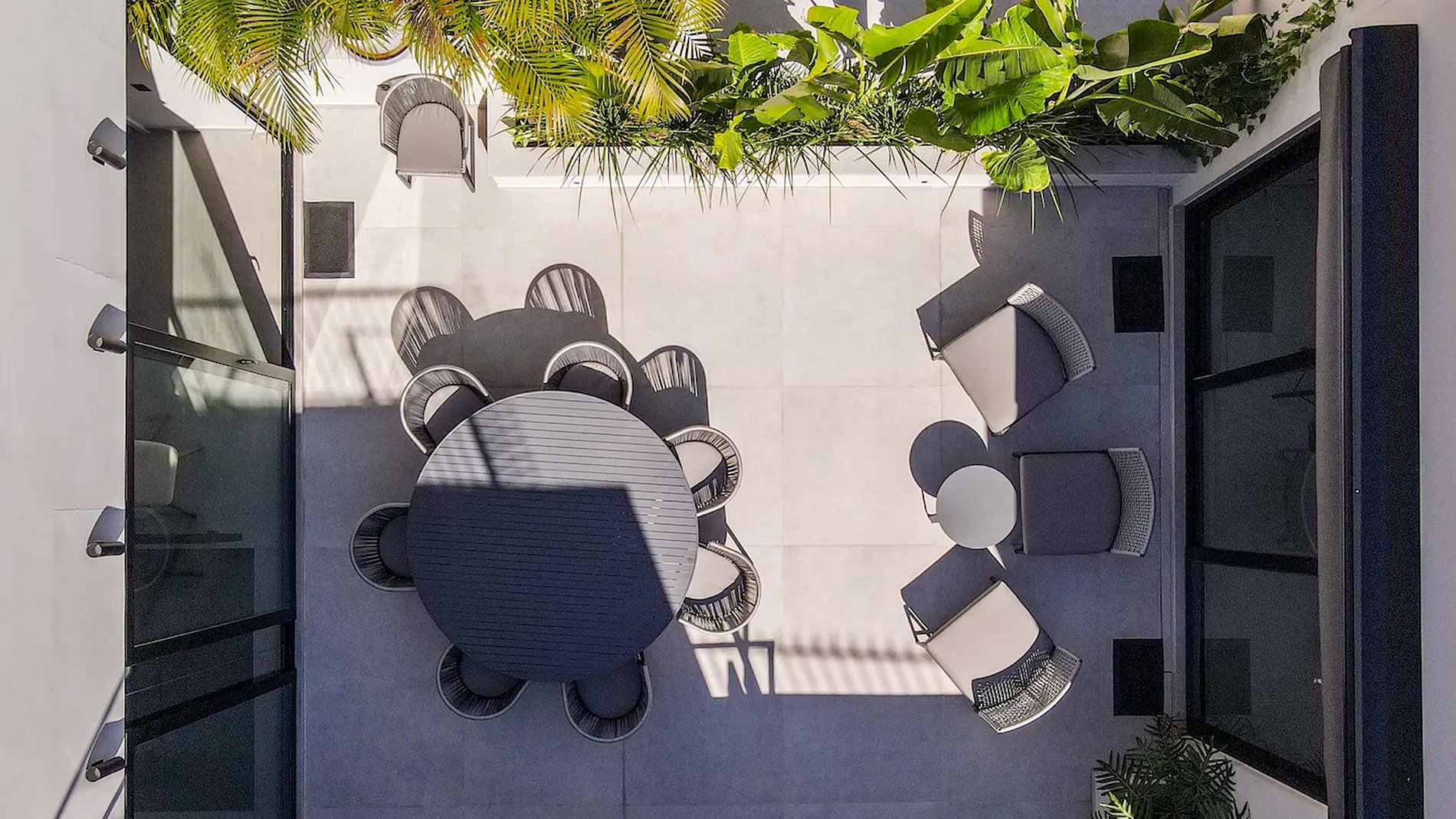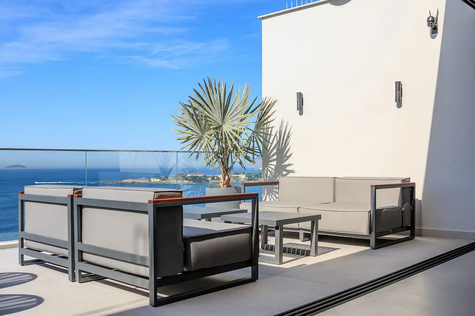 Due ampi balconi, ciascuno di 50 m², aggiungono un tocco speciale: uno offre una vista mozzafiato sulla baia di Copacabana, attrezzato con divani, lettini e un tavolo per il relax all’aperto; l’altro è integrato tra una cucina completamente attrezzata e la sala da pranzo, ideale per cene all’aperto circondate da una vegetazione lussureggiante.