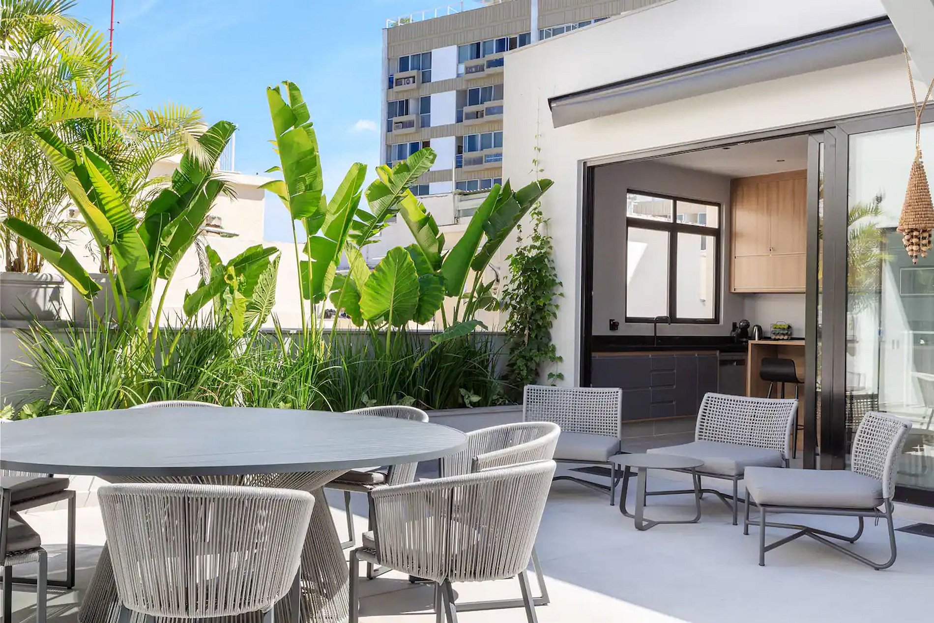 Due ampi balconi, ciascuno di 50 m², aggiungono un tocco speciale: uno offre una vista mozzafiato sulla baia di Copacabana, attrezzato con divani, lettini e un tavolo per il relax all’aperto; l’altro è integrato tra una cucina completamente attrezzata e la sala da pranzo, ideale per cene all’aperto circondate da una vegetazione lussureggiante.