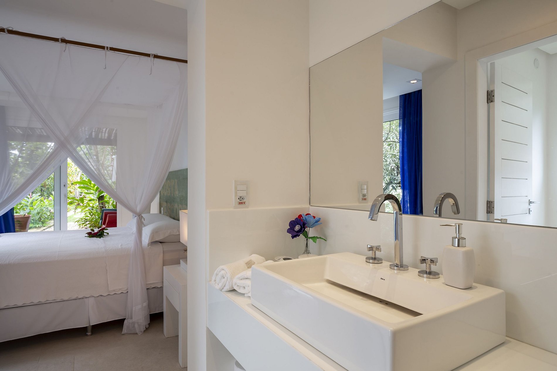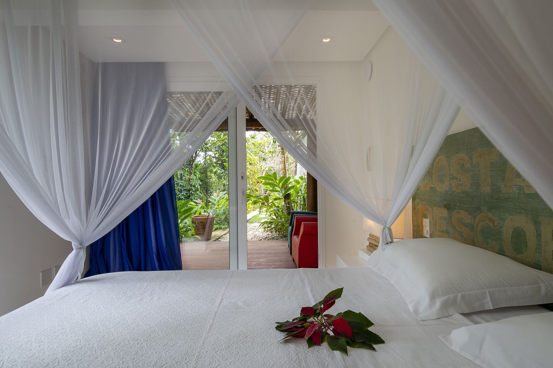 Inoltre, all'esterno, sono presenti due piscine, una con bordo a sfioro e l'altra a specchio. C'è anche una grande sauna secca in vetro con vista sulla foresta, una sala massaggi con minibar, bagno, docce e un'area relax molto bahiana con due amache. Per coloro che vogliono rimanere attivi, sono disponibili anche attrezzature da palestra all'aperto.