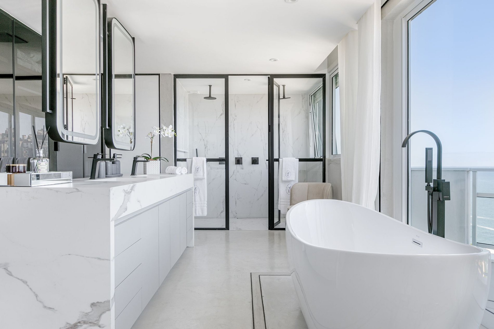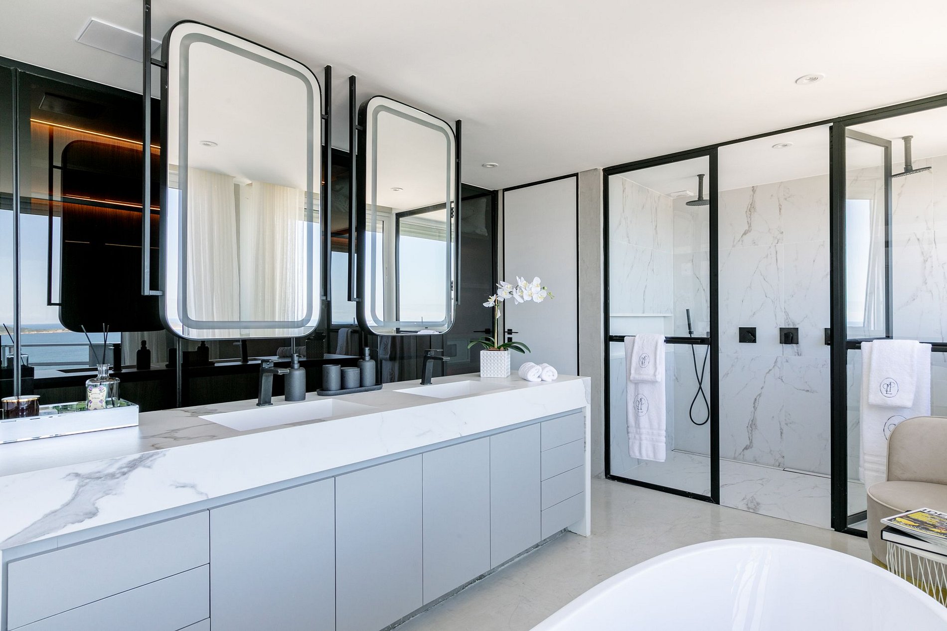 La suite principale merita una menzione speciale: spaziosa, luminosa e circondata dalla vista sull'oceano. Una TV installata sul soffitto, con un ingegnoso sistema di rotazione, consente di guardarla sia dal letto king-size che dalla vasca da bagno, offrendo un comfort impareggiabile.