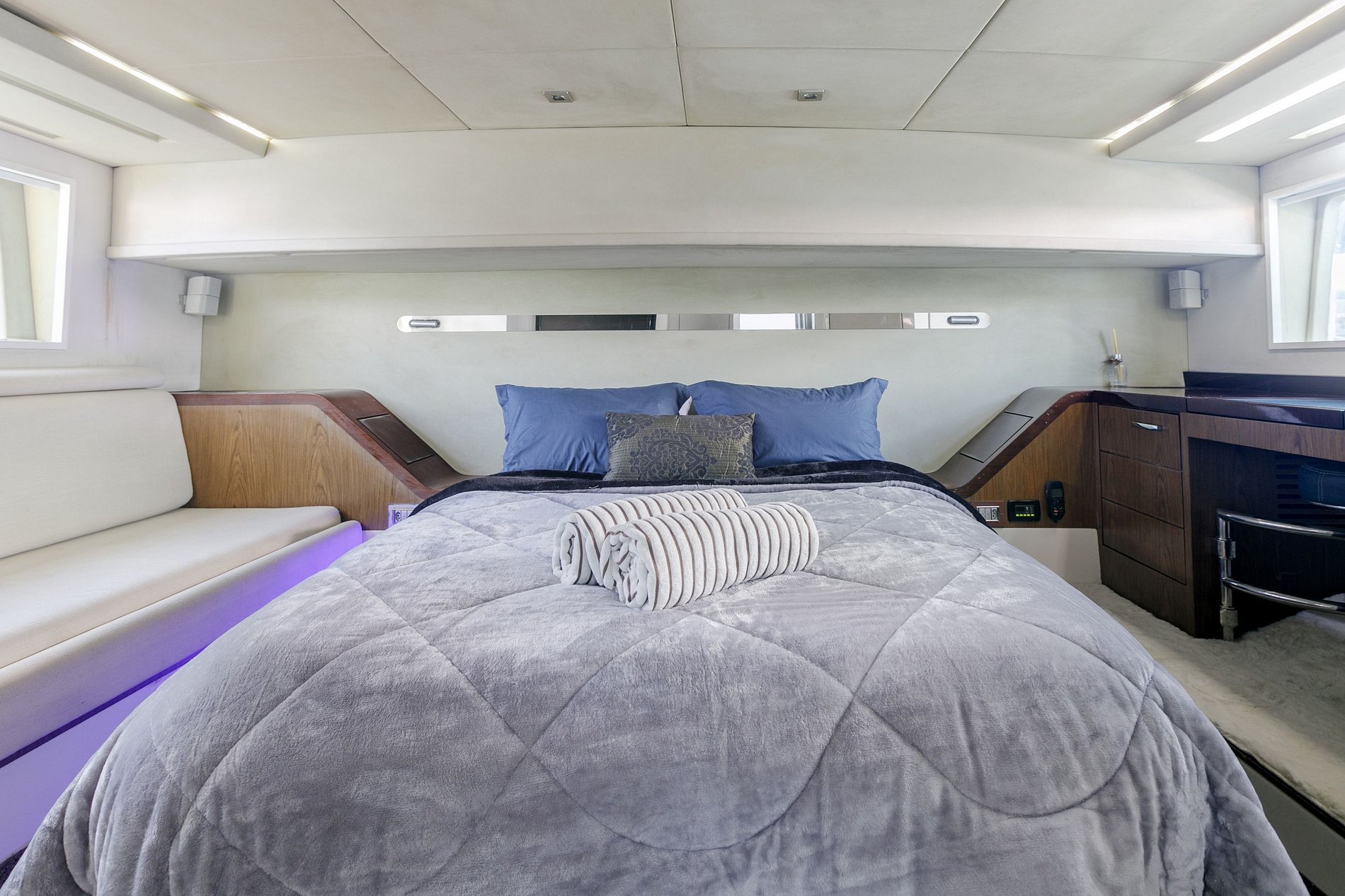 Il soggiorno è spazioso con due comodi divani e sia nelle camere da letto che nel soggiorno sono presenti degli armadi per riporre comodamente gli oggetti. Il motoscafo è inoltre dotato di un generatore da 20 kW, che fornisce energia indipendente a tutti gli ambienti.