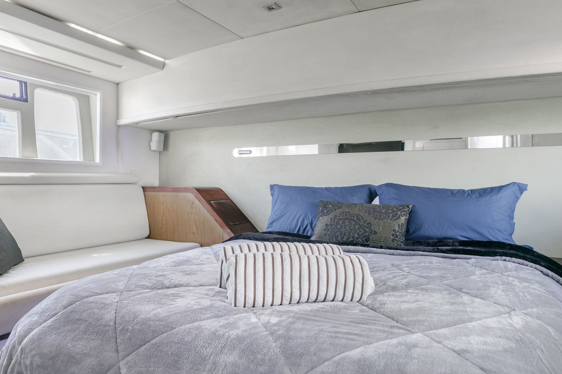 Il soggiorno è spazioso con due comodi divani e sia nelle camere da letto che nel soggiorno sono presenti degli armadi per riporre comodamente gli oggetti. Il motoscafo è inoltre dotato di un generatore da 20 kW, che fornisce energia indipendente a tutti gli ambienti.