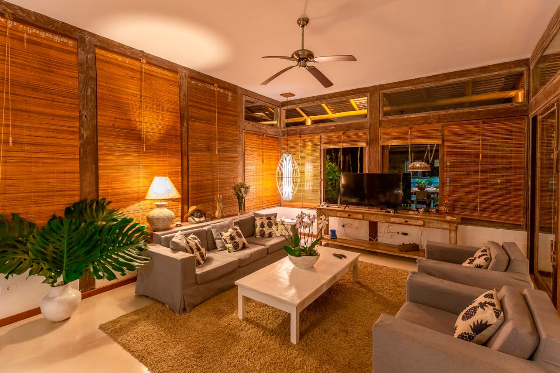 Suíte 3: Cama King, ar condicionado, mosquiteiro, vista para o mar e acesso ao jardim. Acesso independente.