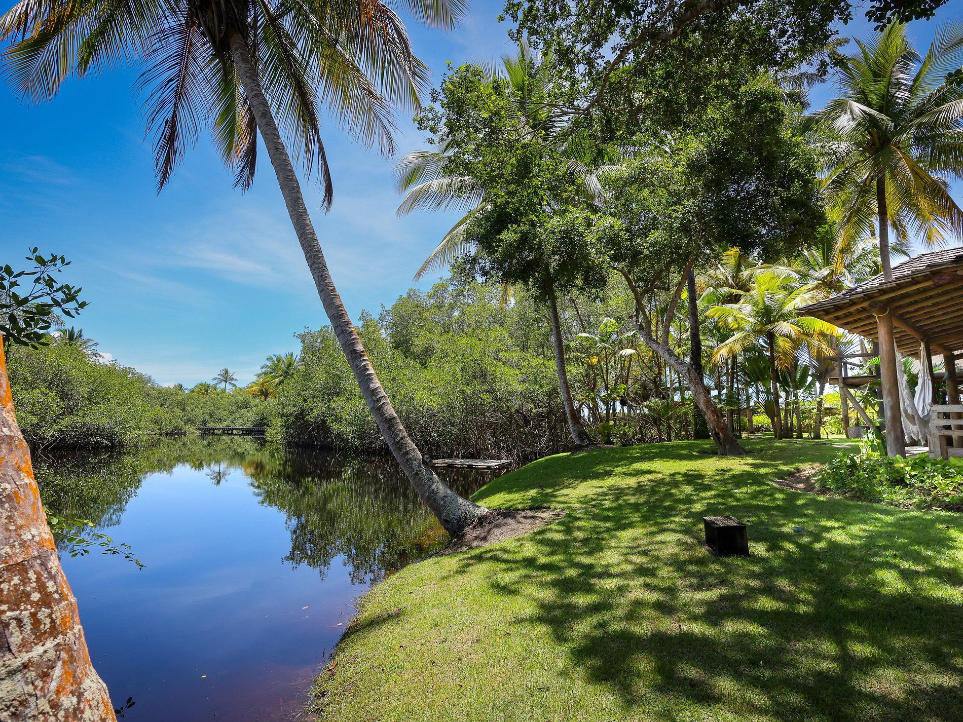 Vila exclusiva com acesso privativo, ligada por uma ponte de madeira sobre uma lagoa do rio Rio da Barra. Rodeada por natureza intocada, a construção se integra perfeitamente ao ambiente, criando uma experiência sensorial.