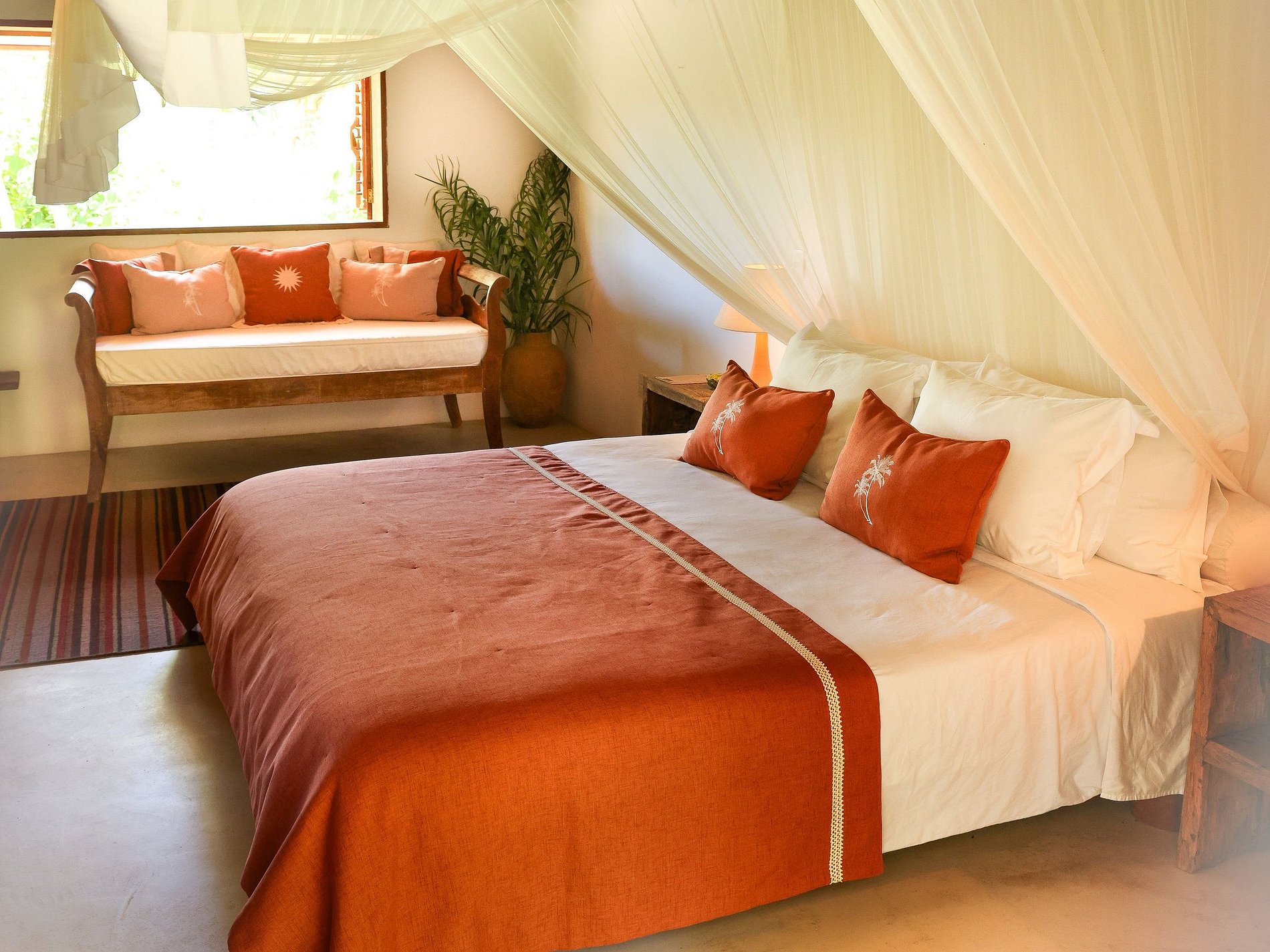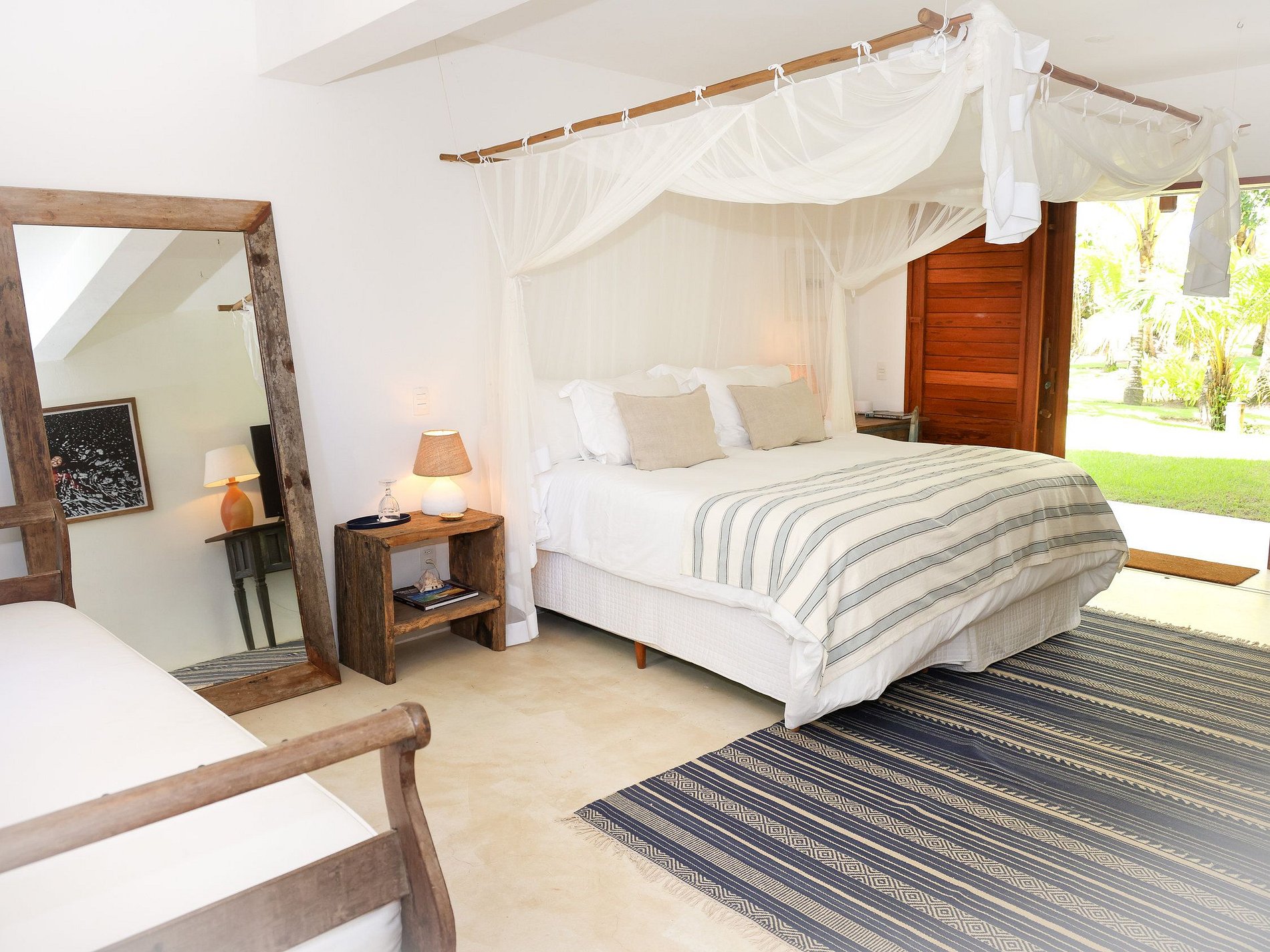 Suíte Master com vista para a lagoa, sala de estar, deck com vista para o mar, banheiro amplo, closet, ar-condicionado, TV de 60”, minibar e cama king-size.