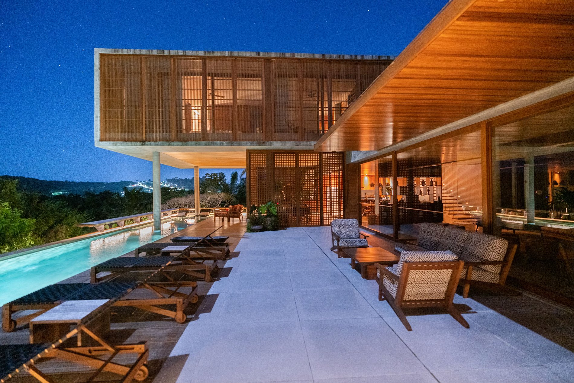 A espaçosa sala de estar no térreo integra-se perfeitamente à cozinha e à varanda, oferecendo vista panorâmica do mar e da Mata Atlântica. Um sistema de som Bose de última geração com 12 alto-falantes no teto e 6 alto-falantes externos nos decks realça o ambiente, enquanto a arte nas paredes, feita pelo artista local Izolag, acrescenta um toque de autenticidade.