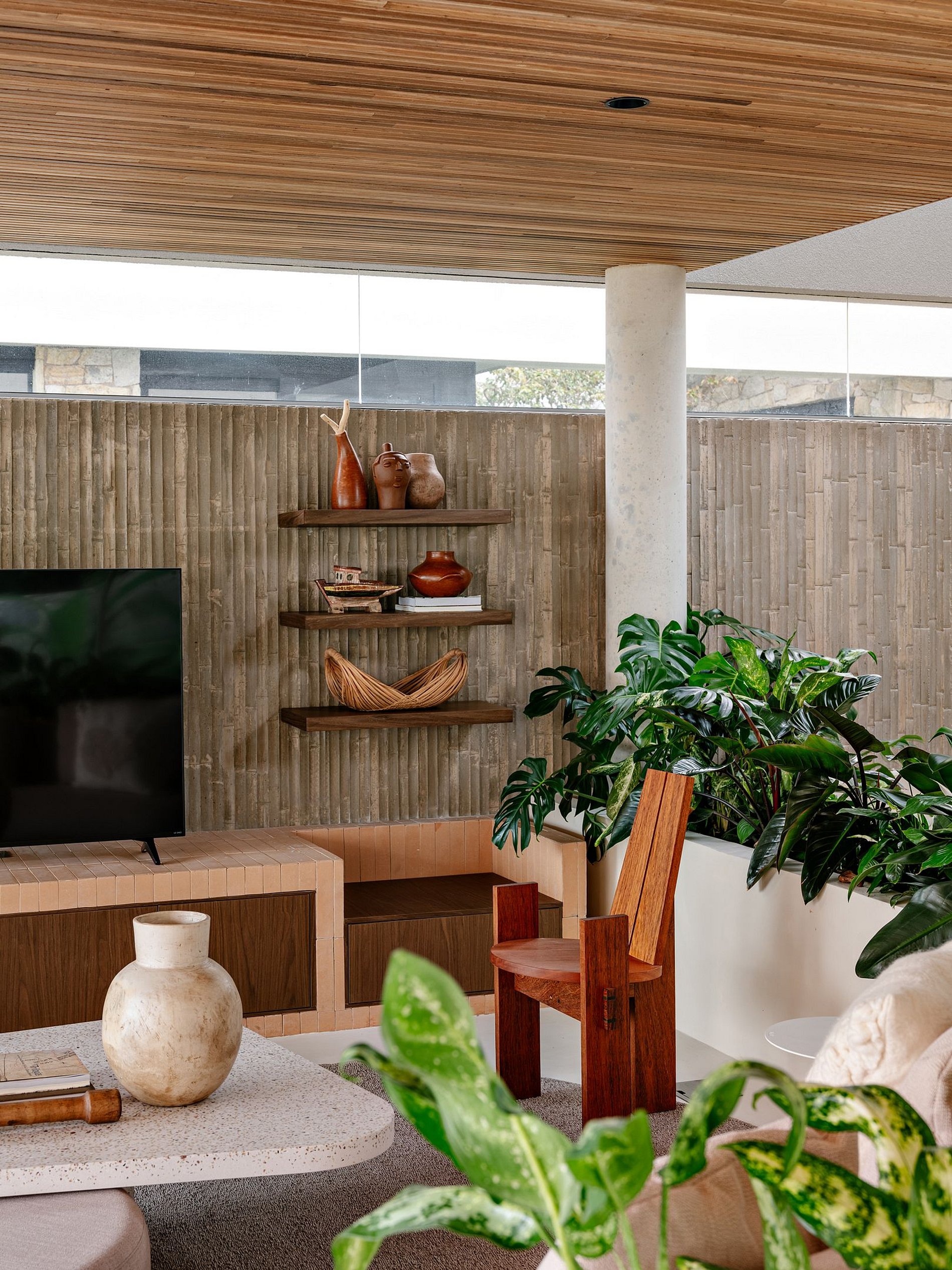 O térreo é pura integração com a natureza: portas de vidro que se abrem para a brisa do mar, uma cozinha gourmet completa e áreas de estar que se fundem ao jardim. A piscina de 20 metros com aquecimento e cobertura automatizada garante lazer com segurança, enquanto a hidromassagem integrada convida ao relaxamento total.