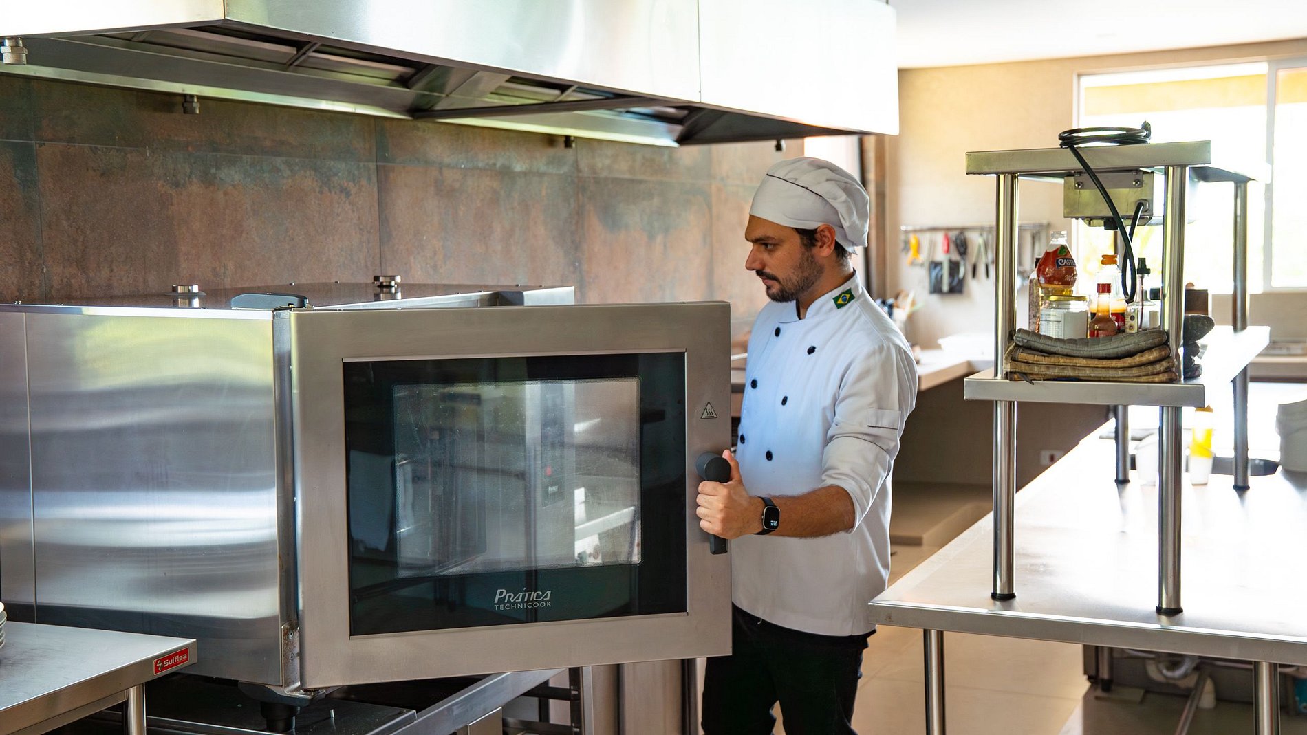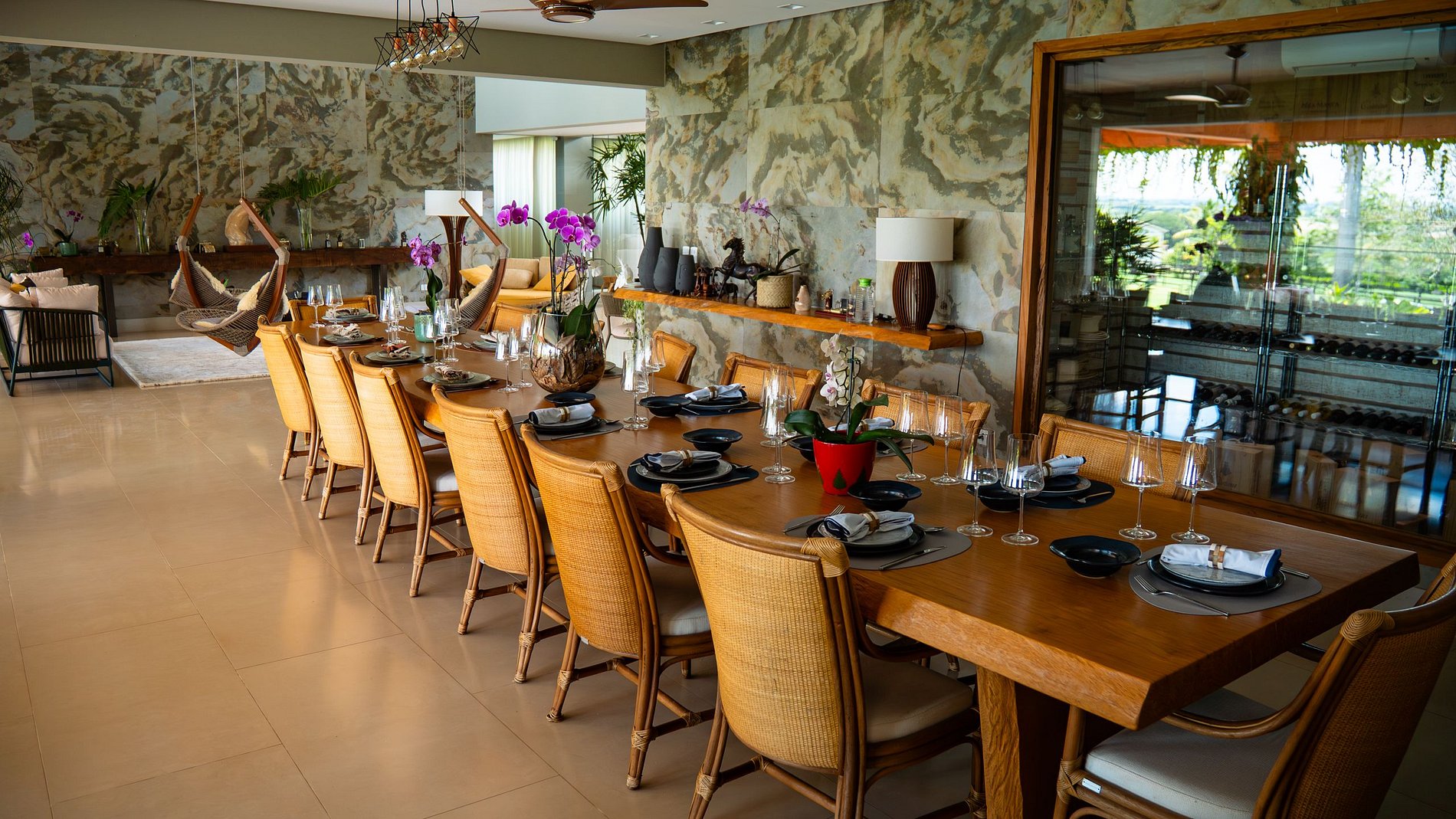 A cozinha é totalmente estruturada para serviço profissional e conta com chef no local, possibilitando uma gastronomia personalizada de acordo com o perfil do grupo. Aqui, a experiência gastronômica deixa de ser apenas um serviço e passa a integrar o conceito da estadia.