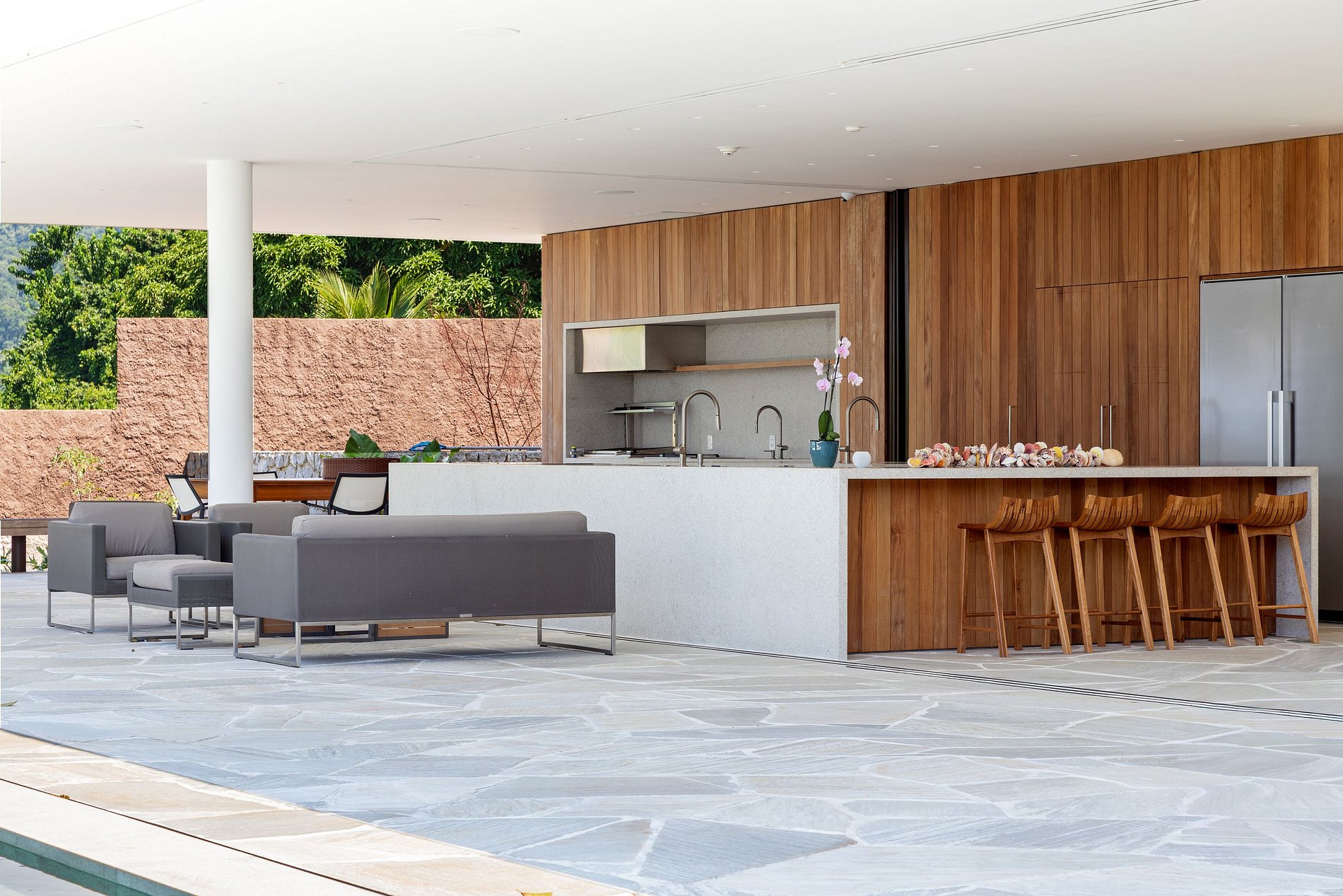 A experiência gastronômica é um dos grandes diferenciais da casa, equipada com eletrodomésticos de altíssimo padrão: freezer e geladeira Miele, gavetas refrigeradas Sub-Zero, além de uma linha completa Wolf com cooktop a gás com queimador específico para wok, cooktop de indução e chapa teppanyaki por indução.