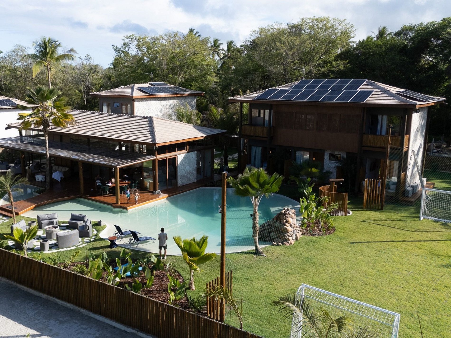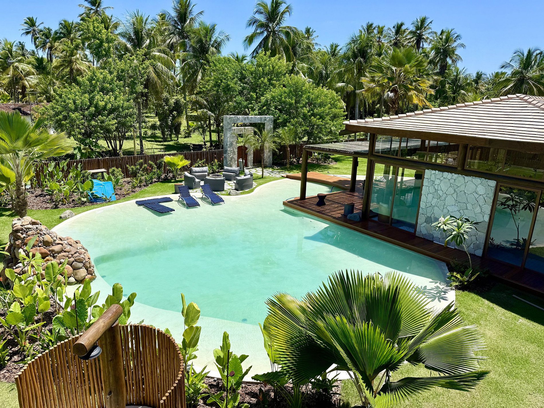 uma prainha particular, criando o cenário perfeito para relaxar, curtir o pôr do sol e viver momentos únicos. O paisagismo tropical, os ambientes abertos e o fire pit no jardim completam a experiência de descanso e contemplação.