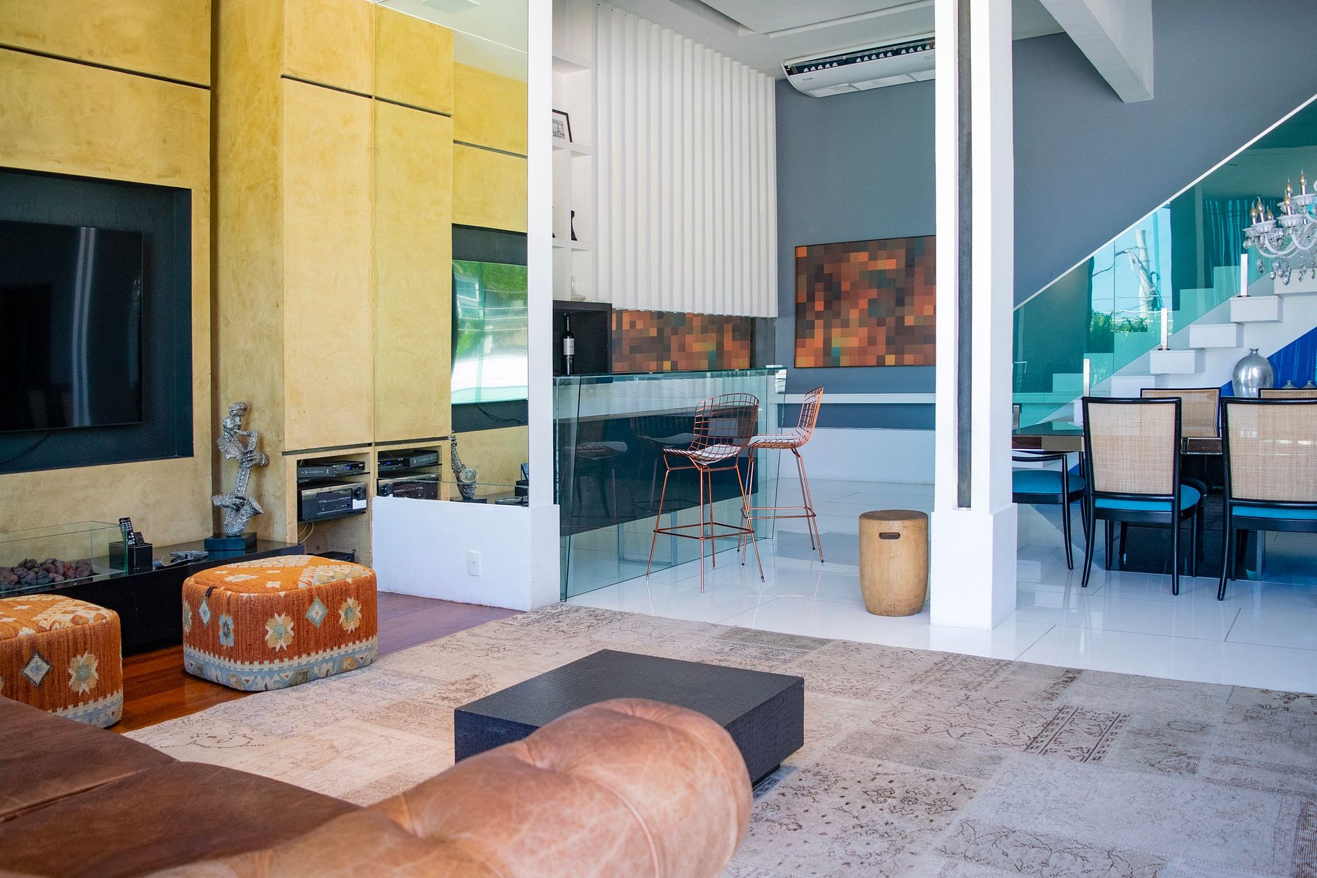 A morada tem seus quatro pavimentos interligados por elevador. No primeiro andar, temos a garagem, com três vagas internas e mais algumas vagas ao ar livre. Ascendendo ao segundo piso, uma ampla e cuidadosa sala de pé direito alto. A TV de 75”, apple TV, fireplace e mini bar trazem a comodidade para os momentos de relaxamento “indoors“. A mesa de jantar de 12 lugares é ideal para reunir familiares e amigos e confraternizar. Ao seu lado, abre-se a grande cozinha, perfeitamente equipada.