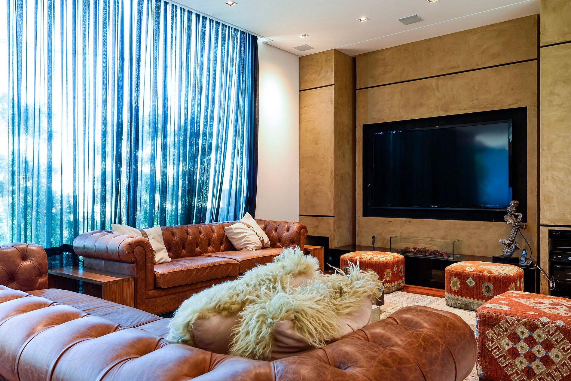 A morada tem seus quatro pavimentos interligados por elevador. No primeiro andar, temos a garagem, com três vagas internas e mais algumas vagas ao ar livre. Ascendendo ao segundo piso, uma ampla e cuidadosa sala de pé direito alto. A TV de 75”, apple TV, fireplace e mini bar trazem a comodidade para os momentos de relaxamento “indoors“. A mesa de jantar de 12 lugares é ideal para reunir familiares e amigos e confraternizar. Ao seu lado, abre-se a grande cozinha, perfeitamente equipada.