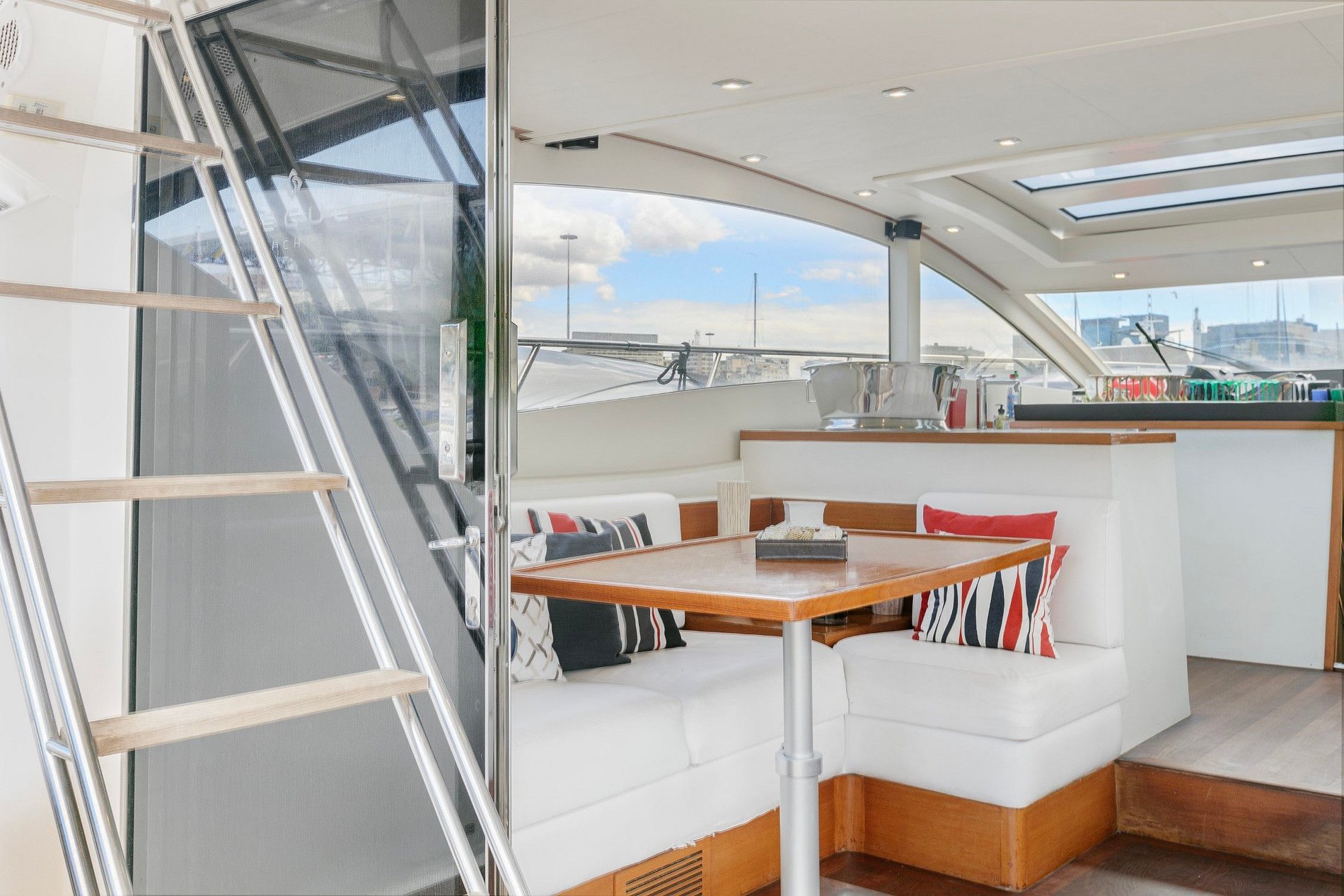 Com dois motores volvo 950 ips, três quartos sendo uma suíte, uma cabine de solteiro que também pode se transformar em casal, e uma cabine de proa com banheiro social, uma cozinha completa com duas geladeiras 2, mini freezer, um micro-ondas um fogão elétrico, sala espaçosa com dois sofás, armários nos quartos e na sala, água quente em todas as torneiras, gerador de 15, máquina de gelo, som Bluetooth, com automação independente em todos os ambientes, churrasqueira.