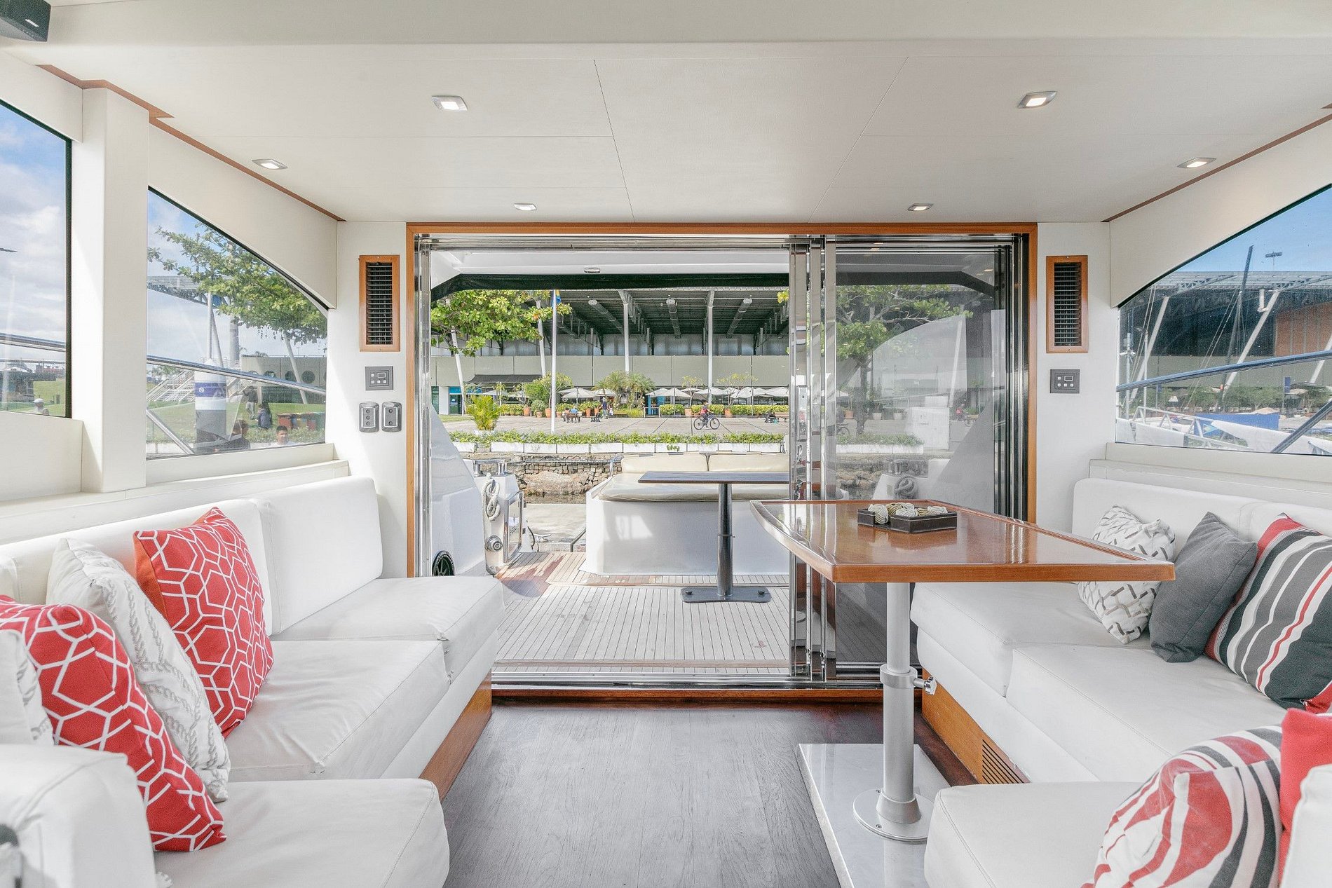 Com dois motores volvo 950 ips, três quartos sendo uma suíte, uma cabine de solteiro que também pode se transformar em casal, e uma cabine de proa com banheiro social, uma cozinha completa com duas geladeiras 2, mini freezer, um micro-ondas um fogão elétrico, sala espaçosa com dois sofás, armários nos quartos e na sala, água quente em todas as torneiras, gerador de 15, máquina de gelo, som Bluetooth, com automação independente em todos os ambientes, churrasqueira.