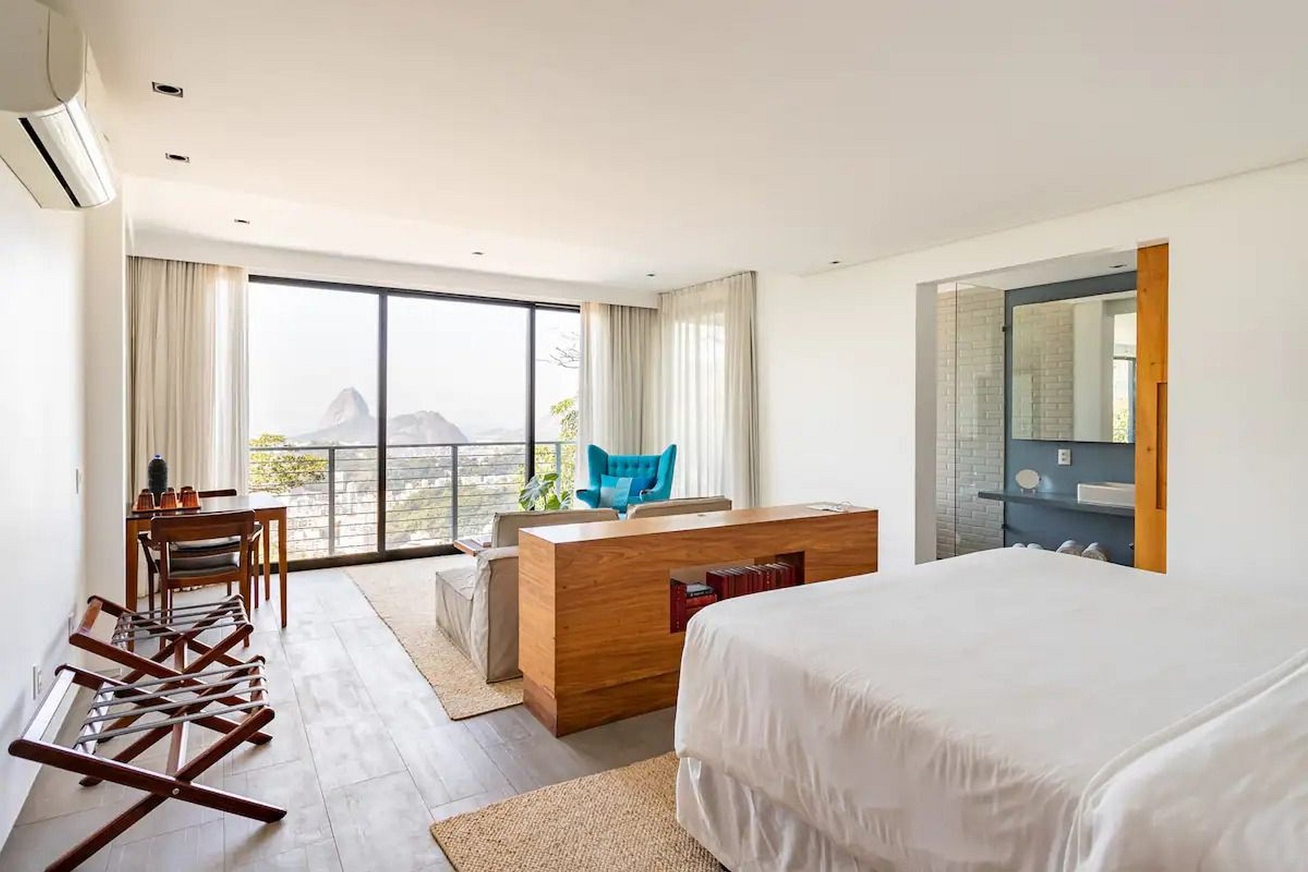 Já o quarto Deluxe dispõe de 20 m2, roupas de cama luxuosas, armários grandes, música Bluetooth, geladeira e cofre, uma casa de banho privativa com chuveiro de efeito chuva e claro, vistas panorâmicas das montanhas, oceano e Pão de Açúcar.