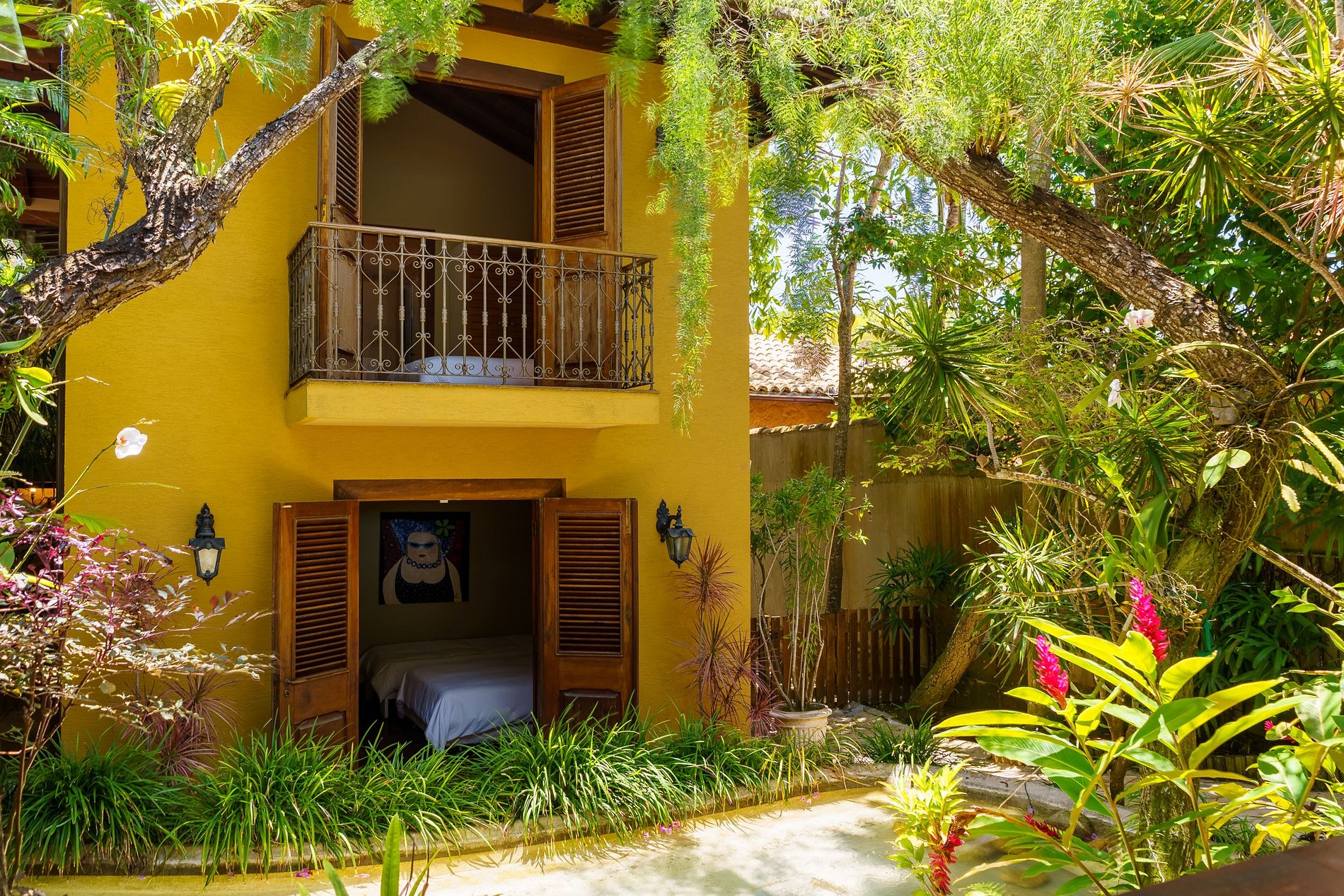 Todos os quartos possuem ar condicionado, varandas ou acesso direto ao jardim. A suíte master, no segundo andar, abrange cama King size, um convidativo sofá de três lugares, banheira de hidromassagem e banheiro com bancada de duplos espelhos e pias duplas.