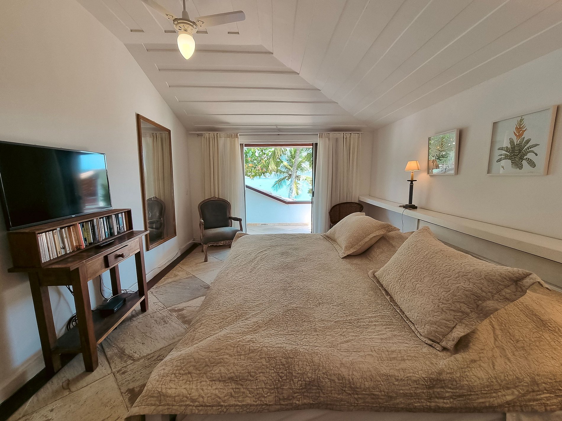 Uma mansão ampla e espaçosa à beira mar, cercada por jardins e abrigada por coqueiros é a atmosfera perfeita para acomodar com todo conforto e comodidade, grupos de convidados. Desde sua área interna, com suítes climatizadas, uma cozinha inteiramente equipada, bar e salas integradas a seu exterior com piscina, sauna, chuveirão e área gourmet. A jóia da casa fica por conta do charmoso pergolado florido, quase “pé na areia”, onde é possível realizar encontros e refeições ao ar livre emoldurados pelo azul paradisíaco do mar da Ferradura.