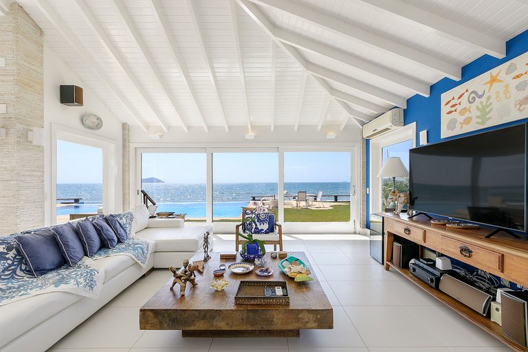 Esta propriedade de 3 suítes está situada diretamente na beira da Praia Rasa, em Búzios, oferecendo uma vista constante do mar e a conveniência de acesso direto à praia. A casa, distribuída em dois andares, é projetada com grandes janelas que permitem a entrada de luz natural e ventilação, criando um ambiente claro e arejado.