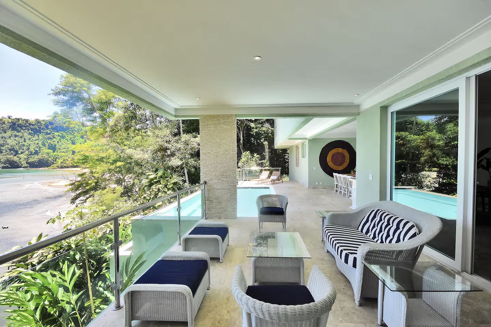 Dentro de uma área de 300 mil metros2 de mata atlântica preservada, em um condomínio de alto padrão com apenas três propriedades e uma praia particular de águas mornas e cristalinas, encontramos essa casa decorada de forma primorosa que combina móveis e materiais de alto luxo com o típico artesanato brasileiro.