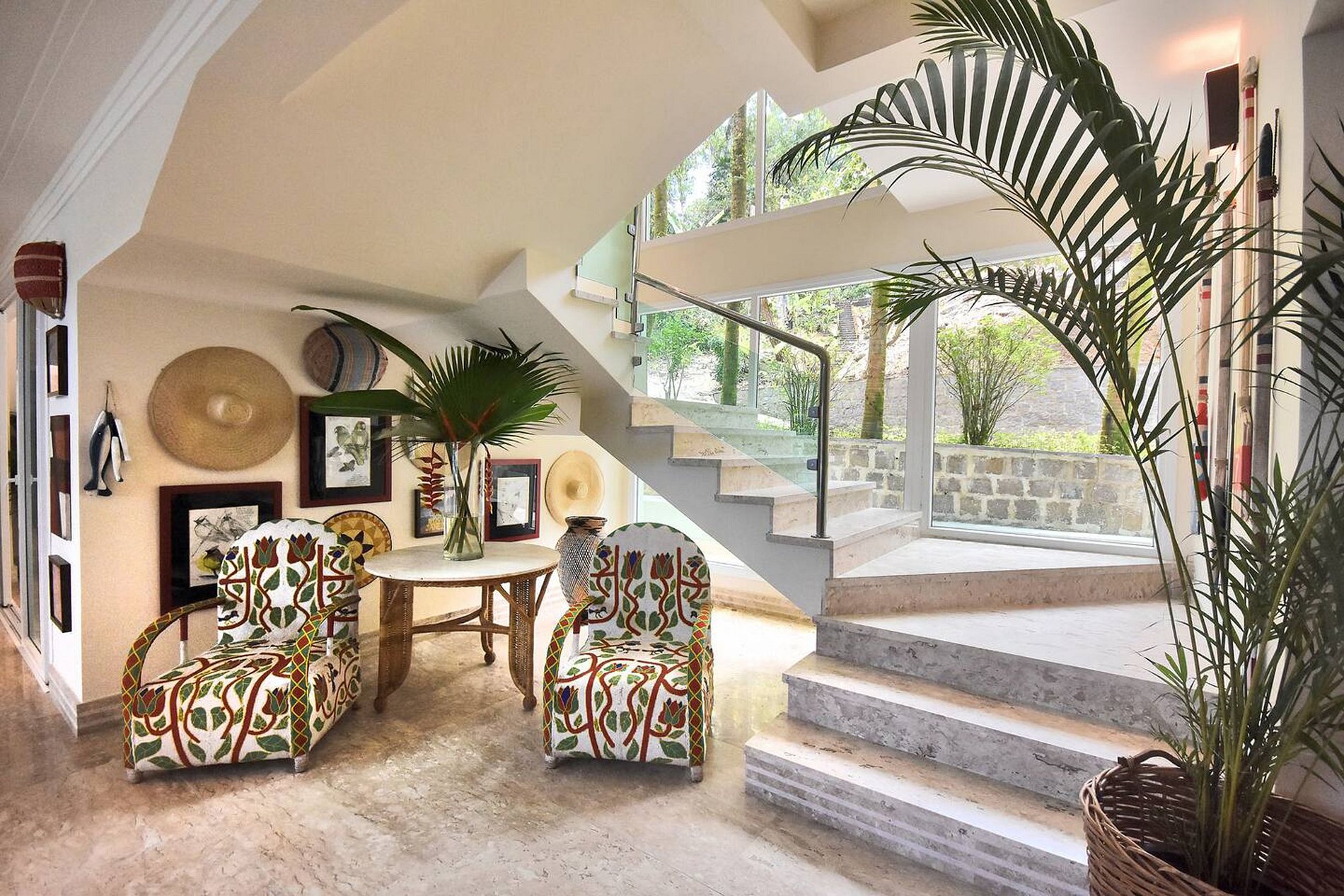 Dentro de uma área de 300 mil metros2 de mata atlântica preservada, em um condomínio de alto padrão com apenas três propriedades e uma praia particular de águas mornas e cristalinas, encontramos essa casa decorada de forma primorosa que combina móveis e materiais de alto luxo com o típico artesanato brasileiro.