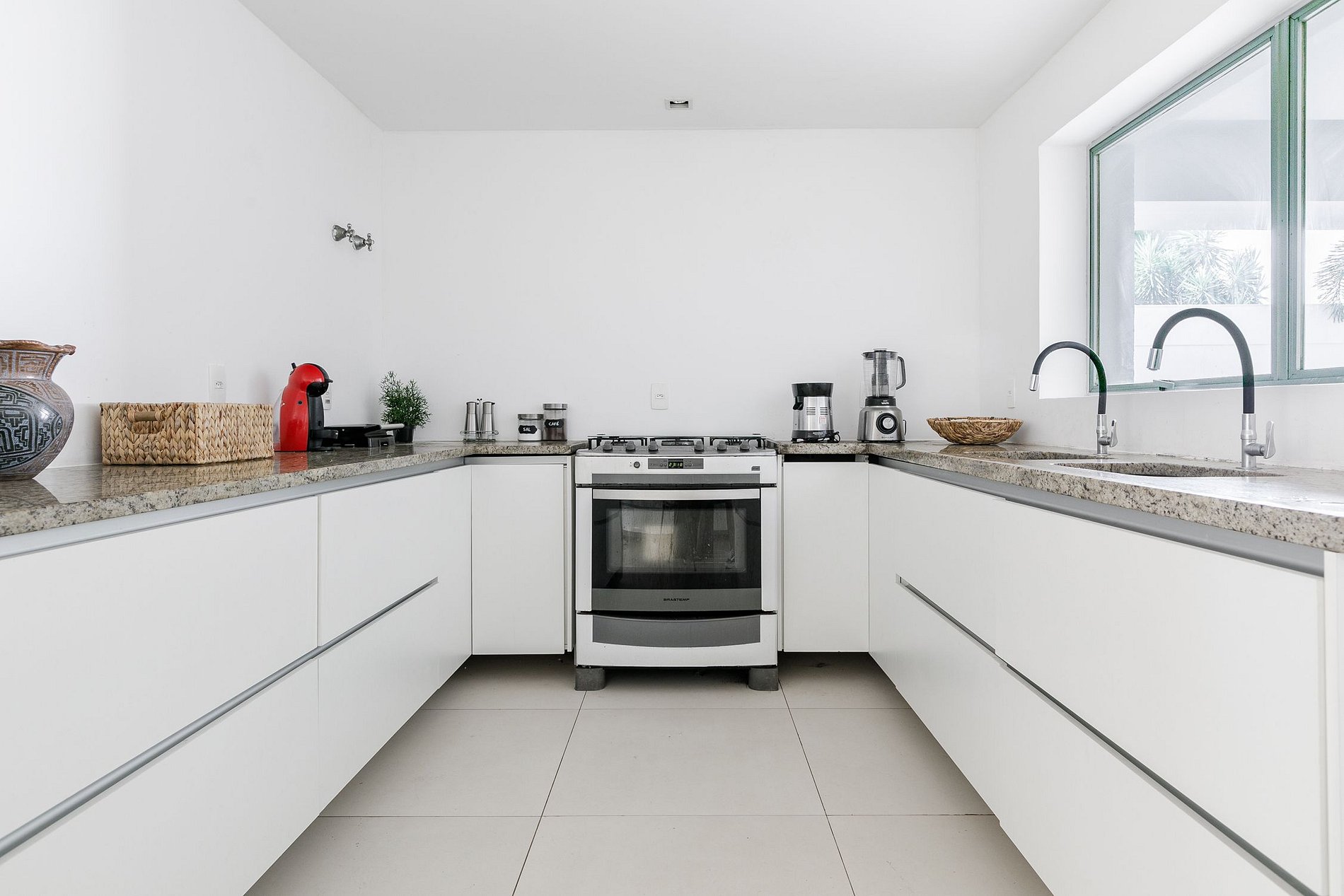 No andar térreo, o interior amplo e arejado facilita a circulação. A cozinha completa em estilo 'americana" é bem equipada, com geladeiras side-by-side e completa muito bem a sala que se abre em varandas com bancos e mesas voltadas para o jardim, onde é possível repousar.