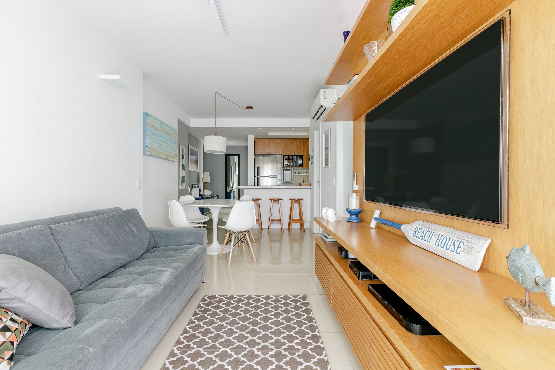 O apartamento em si, com decoração minimalista e despretensiosa é completo, climatizado, com cozinha americana, possui duas suítes, uma com cama queen size e outra com duas camas de solteiro que podem ser juntadas com pillowtop sobreposto e transformadas em cama de casal. Ambas as suítes se abrem em varandas.
