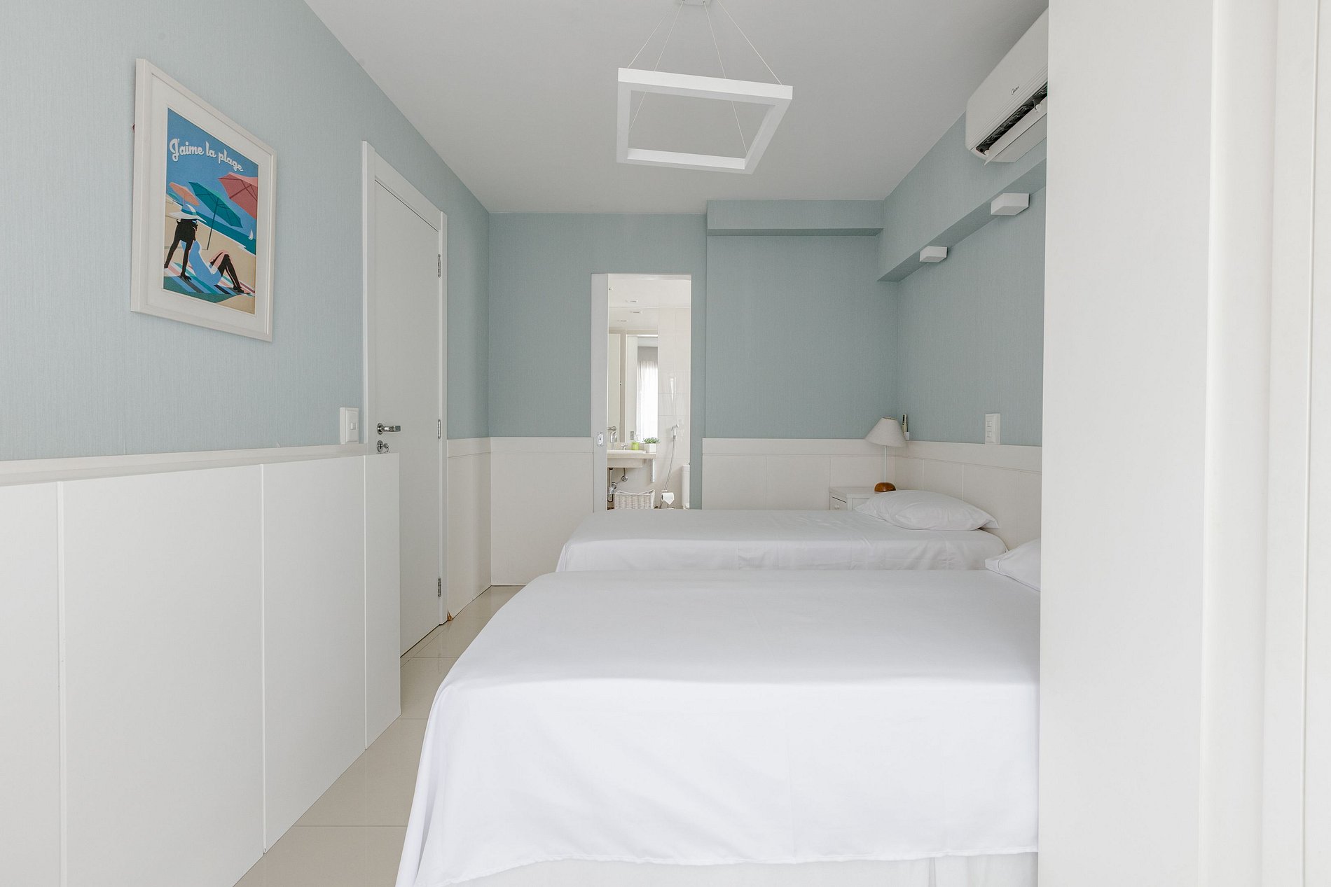 O apartamento em si, com decoração minimalista e despretensiosa é completo, climatizado, com cozinha americana, possui duas suítes, uma com cama queen size e outra com duas camas de solteiro que podem ser juntadas com pillowtop sobreposto e transformadas em cama de casal. Ambas as suítes se abrem em varandas.