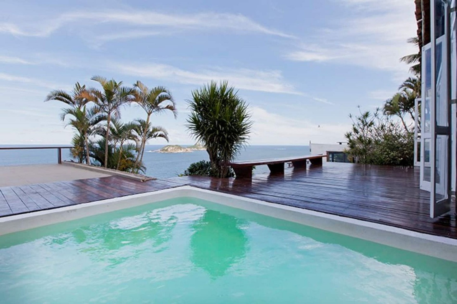 Do lado de fora, a casa apresenta uma piscina edificada sobre a rocha, característica que faz com que sua água sofra alterações de temperatura mais lentas, tornando se sempre mais amena ao mergulho.