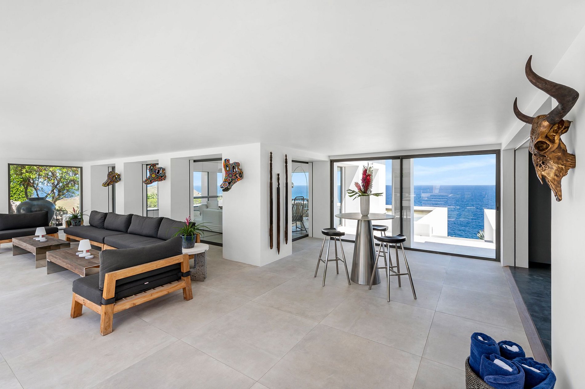 Acomoda até 12 pessoas em suas 6 suítes (4 principais e 2 adicionais nas vilas), oferecendo uma vista espetacular de 180º do mar e das montanhas, com privacidade e integração à paisagem natural. Entre os destaques estão as piscinas de borda infinita, a jacuzzi privada, um spa completo com sala de massagem, uma academia moderna e espaços ao ar livre amplos, ideais para relaxar ou receber convidados.