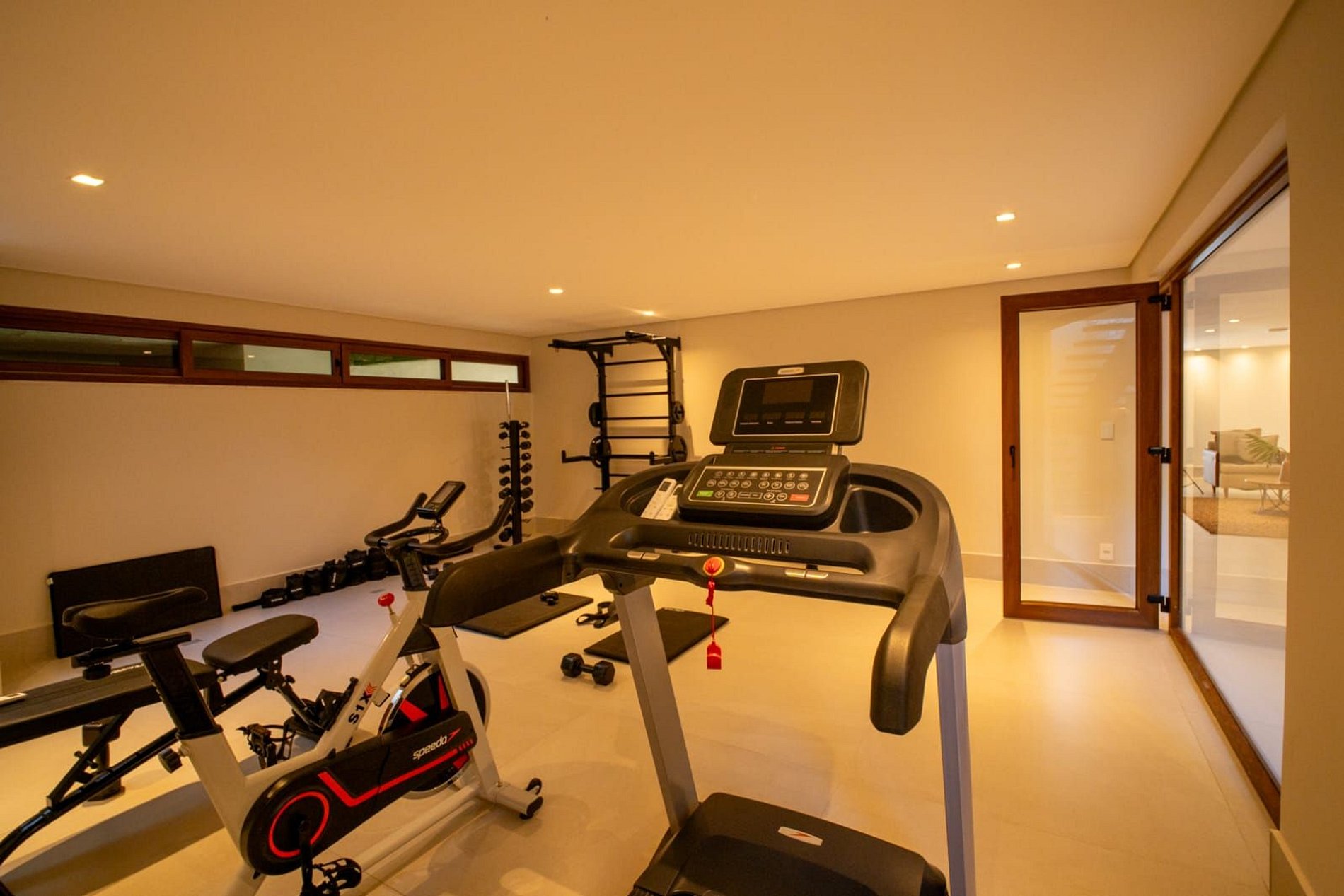 São 9 suítes elegantemente decoradas, todas com camas king size, ar-condicionado, closets e banheiros espaçosos com duchas modernas. Algumas possuem vistas deslumbrantes para o mar, outras para a mata, e há ainda uma suíte temática infantil, perfeita para famílias com crianças. A residência acomoda confortavelmente até 18 hóspedes, garantindo conforto absoluto em cada detalhe.