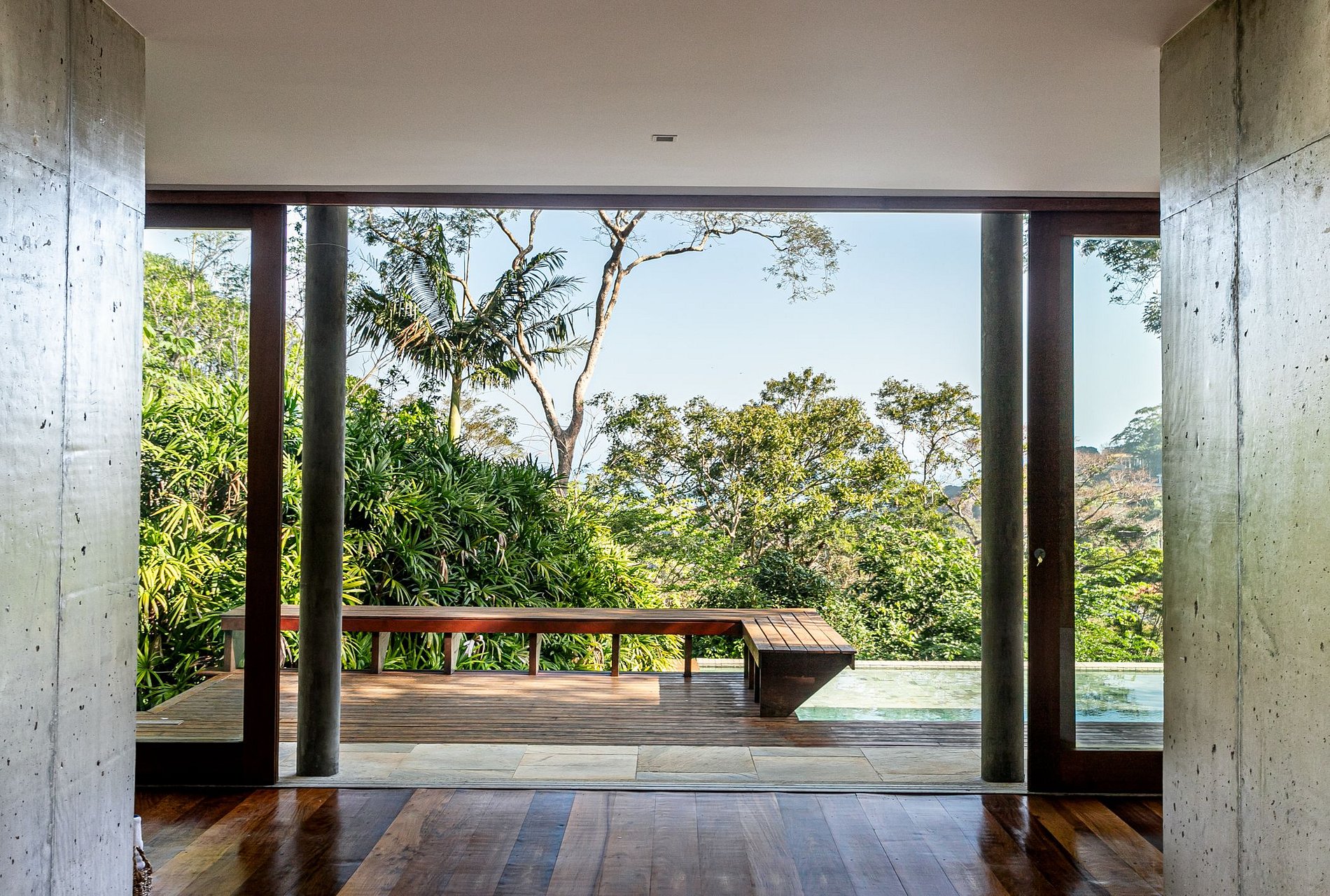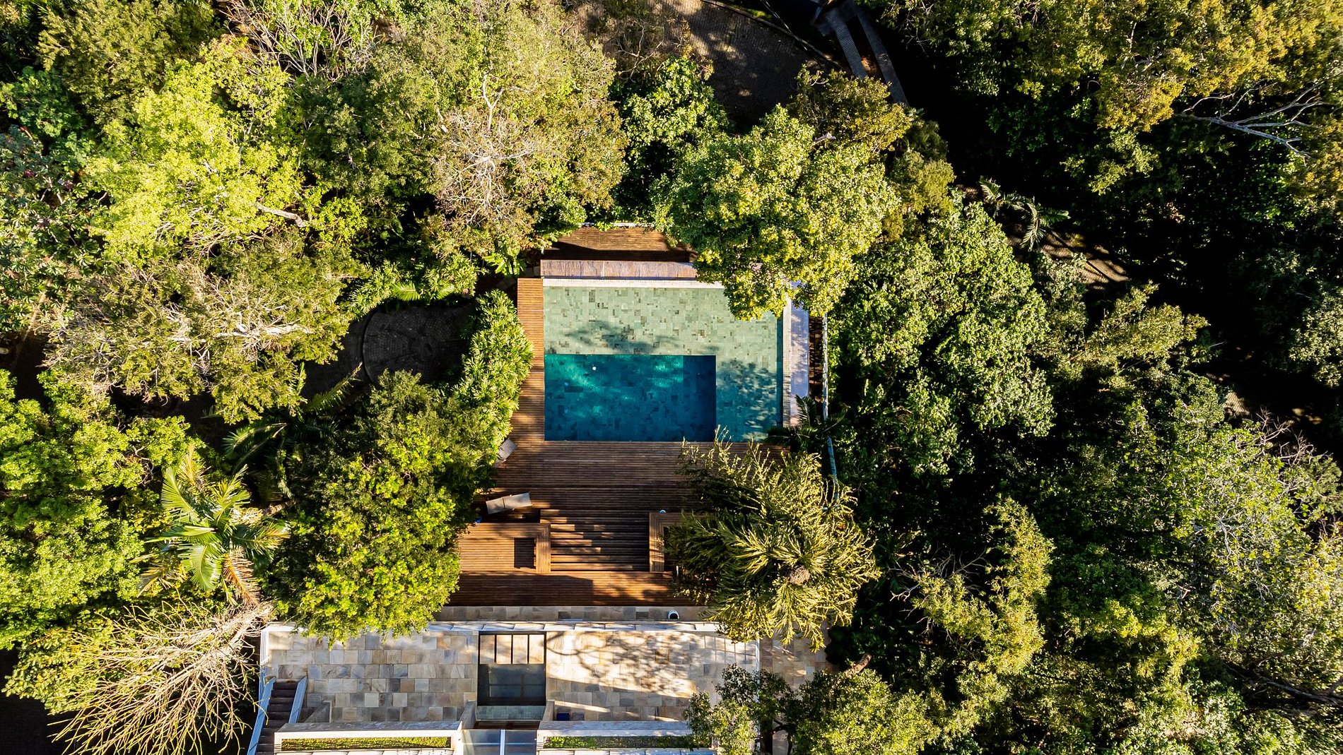 Externamente, a propriedade é um convite à contemplação e ao lazer. A piscina de borda infinita, circundada por vegetação nativa, proporciona uma experiência sensorial que simula a imersão direta na natureza, enquanto sua disposição arquitetônica favorece vistas que se estendem ao horizonte, reforçando a sensação de integração com a paisagem. Adicionalmente, a presença de uma quadra de tênis proporciona aos aficionados pelo esporte uma opção distinta de entretenimento. A sauna constitui um elemento adicional de conforto, oferecendo um espaço destinado à revitalização física e mental, ideal após atividades ao ar livre.