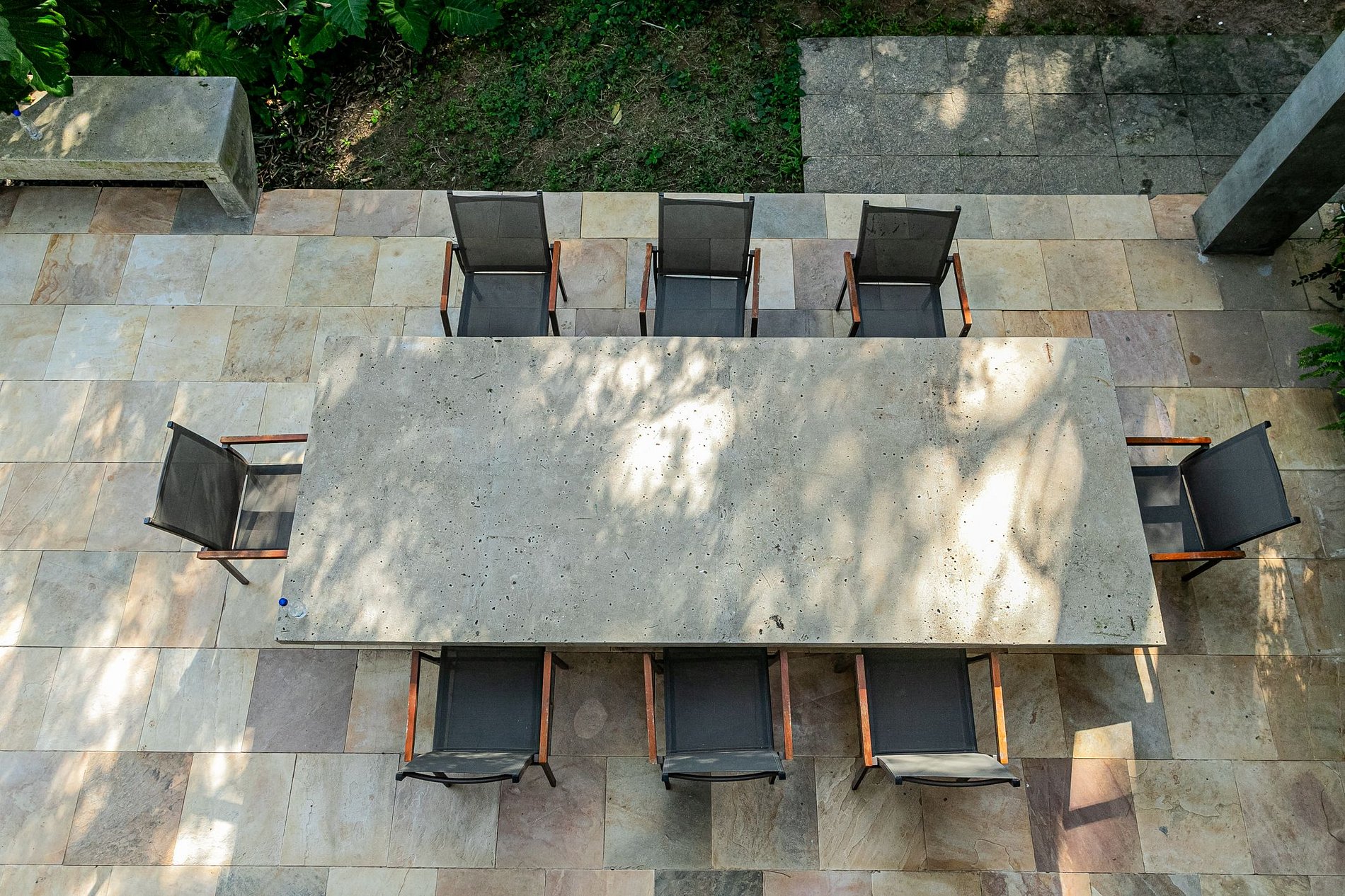 Externamente, a propriedade é um convite à contemplação e ao lazer. A piscina de borda infinita, circundada por vegetação nativa, proporciona uma experiência sensorial que simula a imersão direta na natureza, enquanto sua disposição arquitetônica favorece vistas que se estendem ao horizonte, reforçando a sensação de integração com a paisagem. Adicionalmente, a presença de uma quadra de tênis proporciona aos aficionados pelo esporte uma opção distinta de entretenimento. A sauna constitui um elemento adicional de conforto, oferecendo um espaço destinado à revitalização física e mental, ideal após atividades ao ar livre.