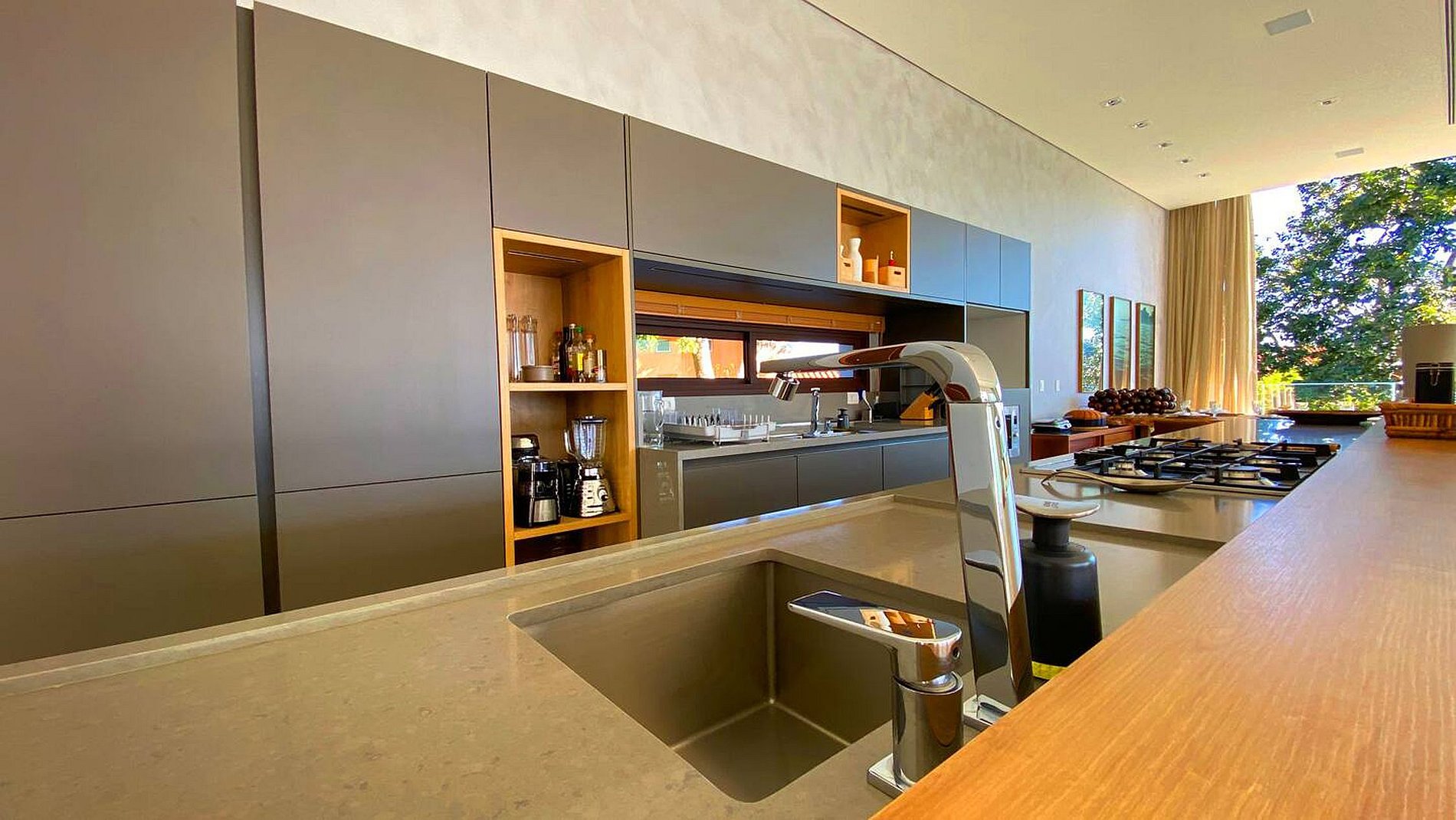 Sua cozinha principal é conectada diretamente a sala de estar e jantar, em plano aberto num salão grandioso, com vista panorâmica para o mar através de sua varanda ou das vidraças que se estendem do chão até o teto.