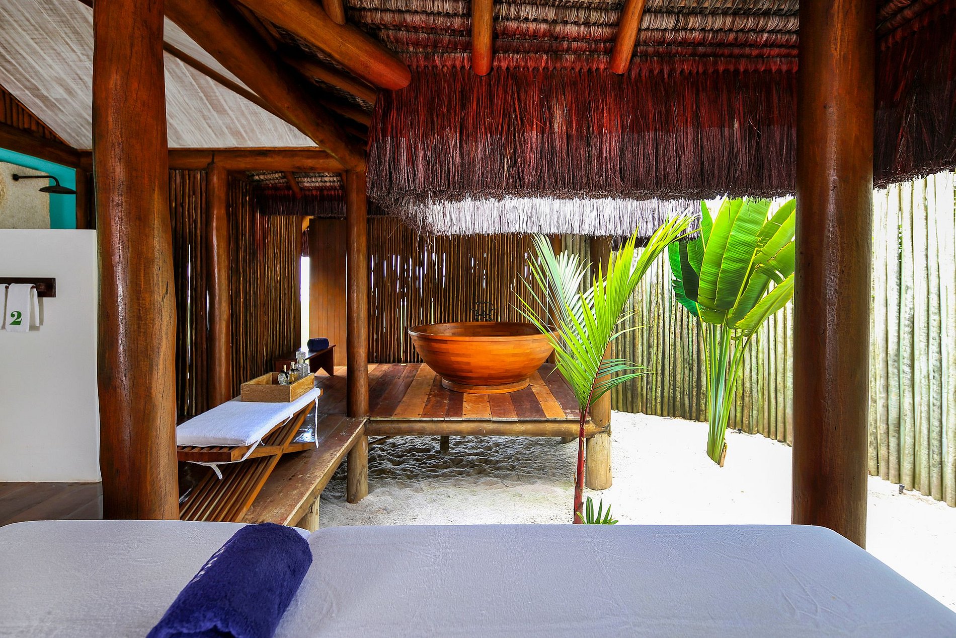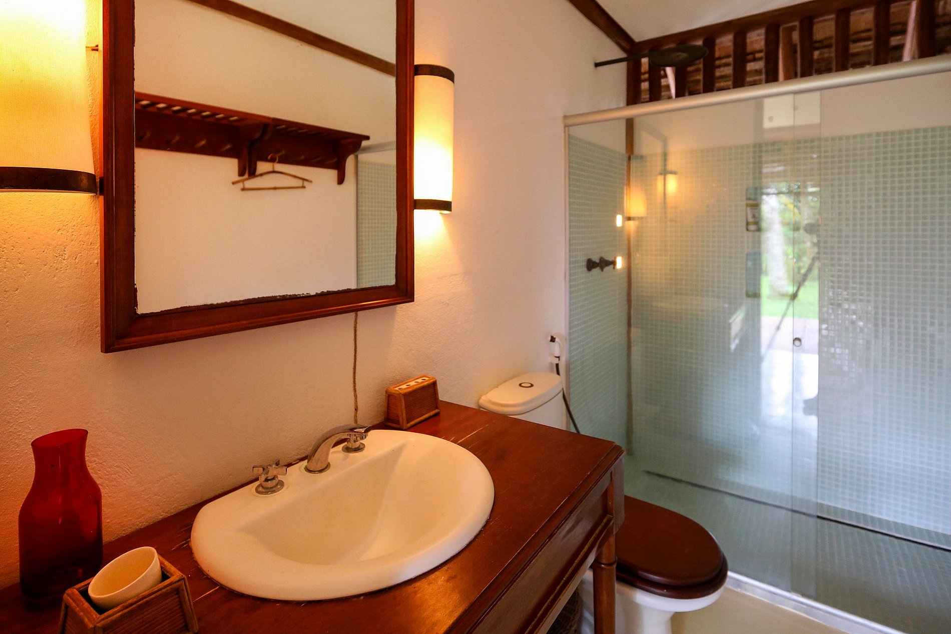 No jardim, 3 bangalôs encantadores oferecem 01 suite cada, com banheiro aberto sobre a vegetação exuberante, chuveiros interiores/exteriores e uma ampla varanda com vista para o mar e/ou o rio. Cada uma dessas 3 suítes tem 2 camas de solteiro que podem ser montadas em uma confortável cama Queen-Size.